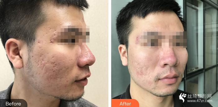 長(zhǎng)期痘痘未清理形成的痘坑,前期先大面積清理痘痘,再通過(guò)療程點(diǎn)陣的方法改良面部痘坑及疤痕情況。