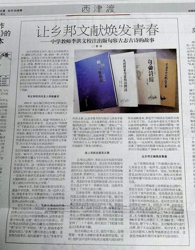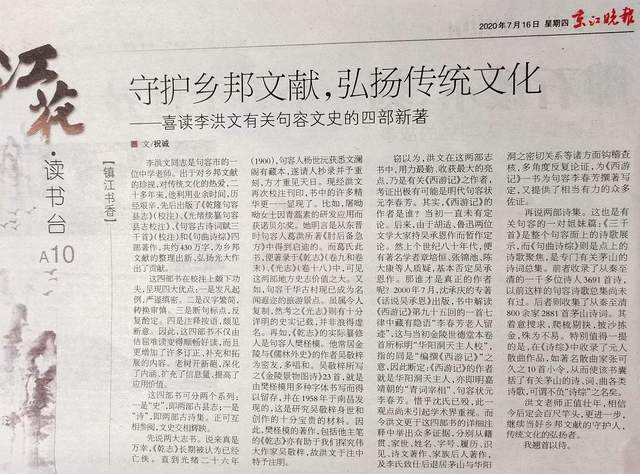 祝誠(chéng)教授《京江晚報(bào)》(2020.7.16)介紹作者四書(shū)之“喜讀李洪文有關(guān)句容文史的四部新著”書(shū)評(píng)。