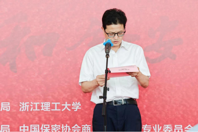 出席本次展覽活動的領(lǐng)導(dǎo)和嘉賓有:中央軍委保密委員會原專職委員、保密和檔案局原局長、少將吳洪東,青島市國家保密局原局長、中國保密協(xié)會理論文化分會主任吳同斌,廣東省國家保密局原局長、廣東省保密協(xié)會會長張宇,甘肅省國家保密局原局長、甘肅省保密協(xié)會會長李維平,山西省國家保密局原局長張華,青島市國家保密局局長劉偉政,成都市國家保密局原局長周海靈,浙江省委保密辦(浙江省國家保密局)主任(局長)汪曉明,浙江省委保密辦(浙江省國家保密局)原主任(局長)、中國保密協(xié)會商業(yè)秘密保護(hù)專業(yè)委員會首席顧問杜德榮,浙江省委辦公廳老干部處處長沈劍霞,杭州市委副秘書長、市委保密委專職副主任、市委保密辦(市保密局)副主任(副局長)顧江,浙江理工大學(xué)黨委副書記陶偉華,時(shí)代中國雜志主編、樂石社秘書長南沙,浙江航天潤博測控技術(shù)有限公司代表等出席開幕式。開幕式由學(xué)校辦公室主任、保密工作辦公室主任陳善曉主持。