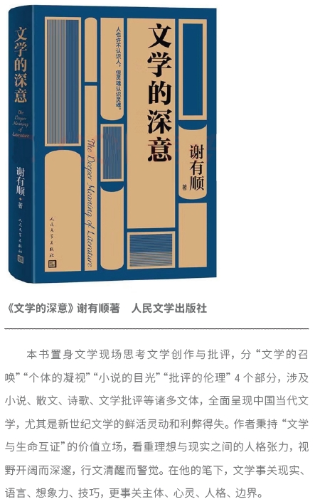 在當(dāng)下的文學(xué)界,學(xué)科化與市場(chǎng)化對(duì)文學(xué)批評(píng)的雙重?cái)D壓已成為一個(gè)無(wú)法忽視的現(xiàn)實(shí)問(wèn)題。批評(píng)的使命何在?文學(xué)的本質(zhì)追問(wèn)是否還能得到回應(yīng)?隨著文學(xué)研究日益知識(shí)化、專(zhuān)業(yè)化、學(xué)科化,文學(xué)批評(píng)也更多地成為一種知識(shí)演繹的工具,而少了與生命和心靈的對(duì)話(huà)。如何在當(dāng)下復(fù)雜的文學(xué)生態(tài)中,仍然發(fā)揮文學(xué)批評(píng)應(yīng)有的光彩和力量?謝有順《文學(xué)的深意》(人民文學(xué)出版社2024年11月版)一書(shū)是特別值得重視的個(gè)案。