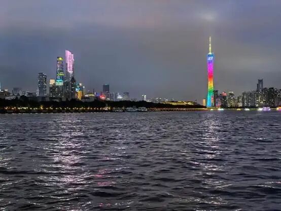 海印公園無圍墻,園內(nèi)園外景致交融。沿江的堤岸邊,有縱橫東西的一條綠蔭大道。人們或倚欄閑談,或漫步江畔觀景,或騎行,感受江風(fēng)與綠植環(huán)繞的愜意?。黃昏時(shí)分,潮水裹挾夕陽(yáng)的余暉緩緩?fù)巳?。此刻的城市樓宇成了舞臺(tái)的布景,珠江的浪聲是天然的配樂,在我眼前呈現(xiàn)出一幅美麗的畫卷,“落日霞光似火燒,夕陽(yáng)余彩赤金描。珠江碧浪風(fēng)光好,廣州塔高呈細(xì)腰?!???珠江兩岸的萬家燈火與流動(dòng)的游輪燈光交織,為夜色增添幾分浪漫,人們盡情享受此刻的歡愉。