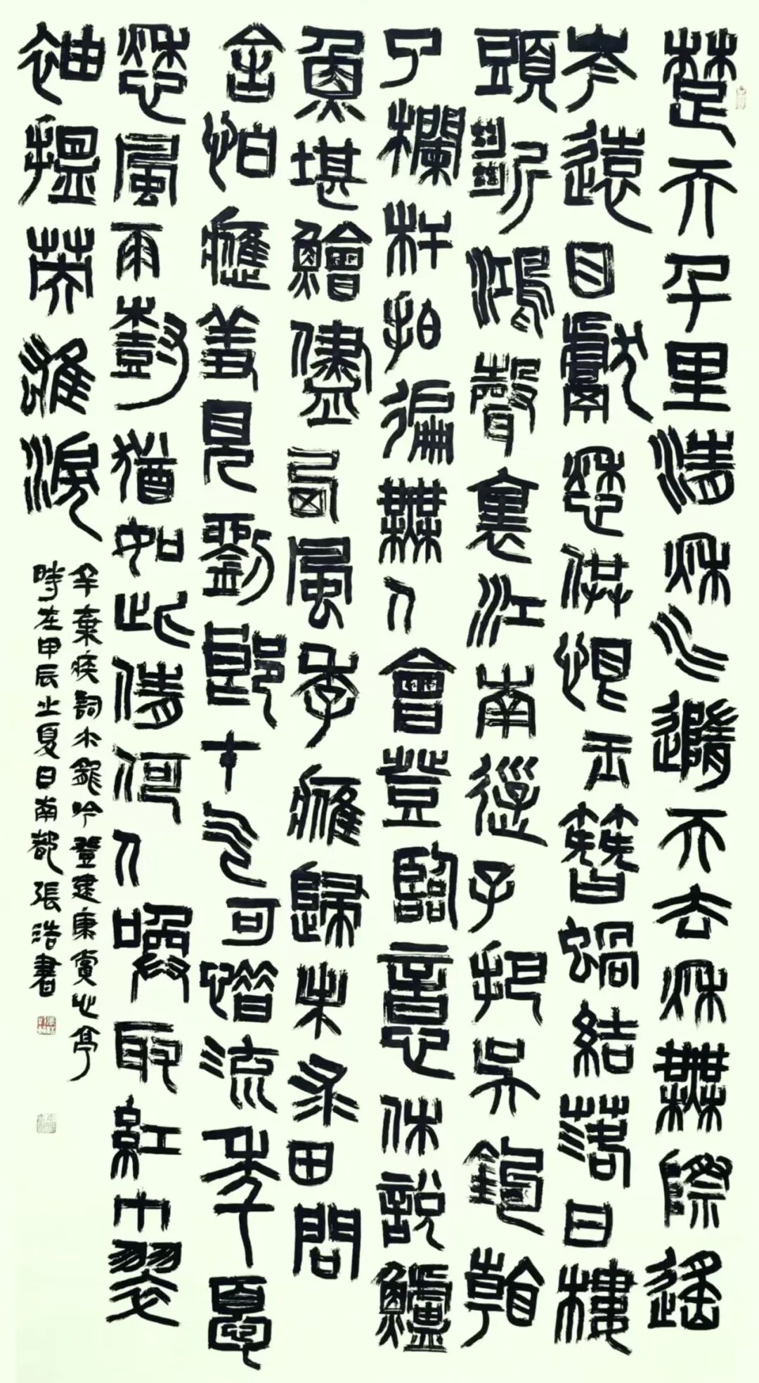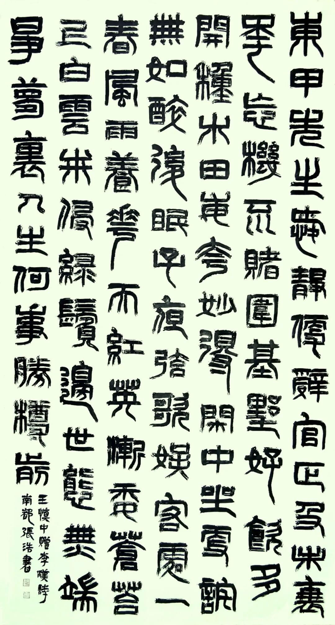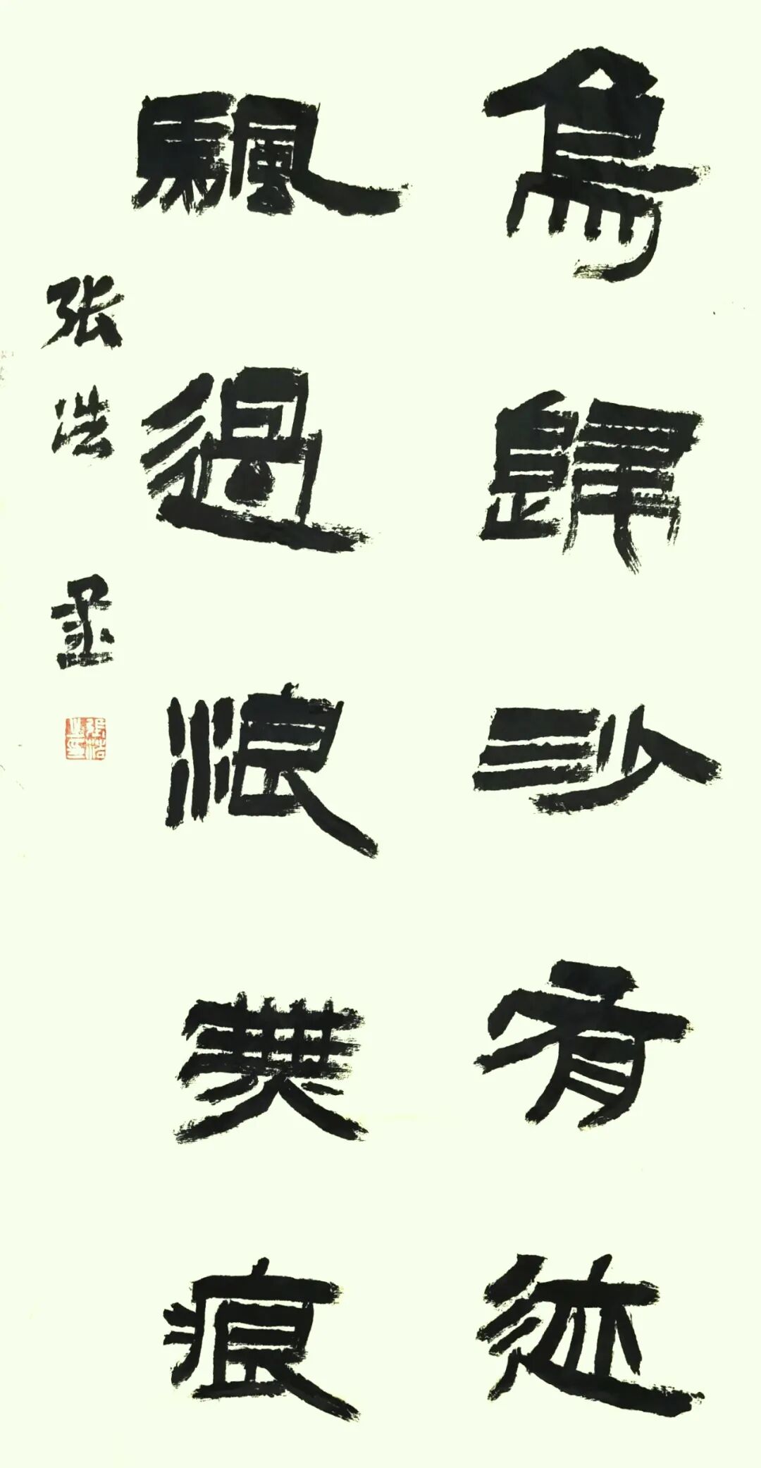 張浩先生的書法彌漫著秦漢人的氣息,高古、博大,樸茂、雅致……,不跟風(fēng)隨流,無靈巧油滑和嫵媚多姿之態(tài),有謙謙君子之風(fēng)和榮容華貴、超然脫俗的正大氣象。黃山谷云:“書字百病可醫(yī),唯俗不可醫(yī)也”。格調(diào)和氣息決定了書法的品味,格調(diào)和氣息低下的,再好的技法也只是“匠人”而已。