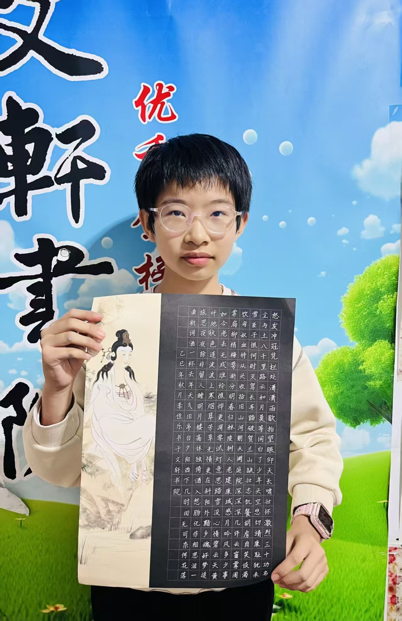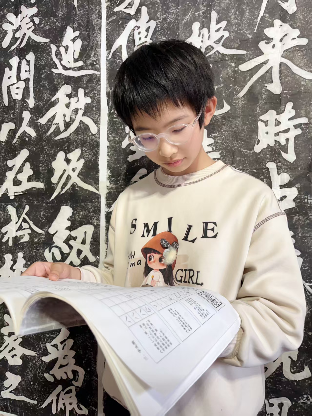? ? ? ?這是她與書院結(jié)緣的第二個年頭,通過學習書法,這孩子臉上總是帶著藝術(shù)的光。她靜靜地坐在那里練字,把一個女孩的專注,釀成了作品紙上獨有的清亮。她握筆時指尖的靈動,創(chuàng)作時專注的眼神都是認真的模樣。