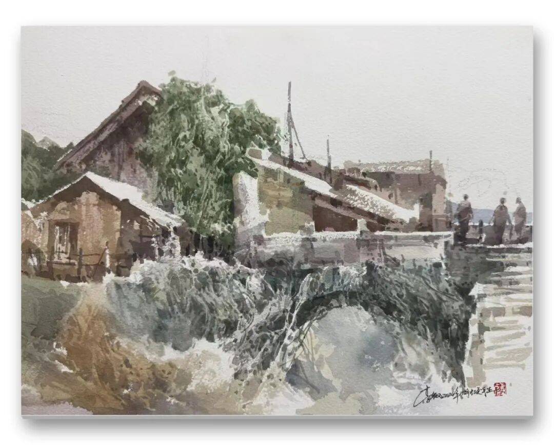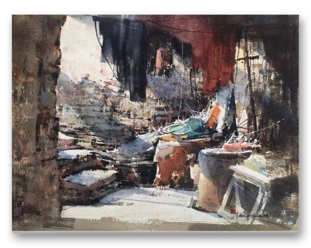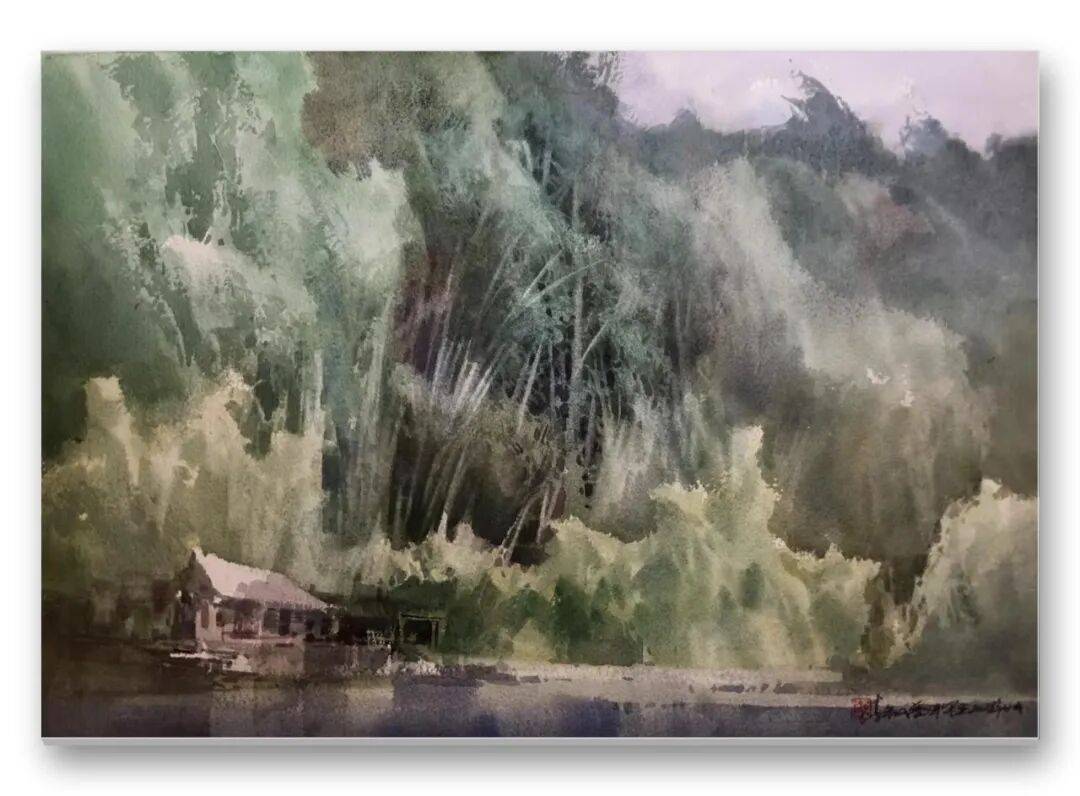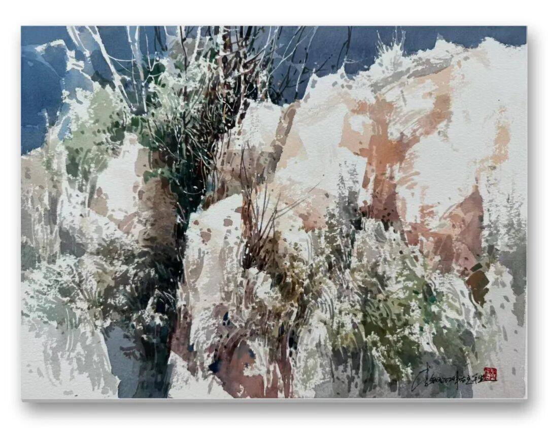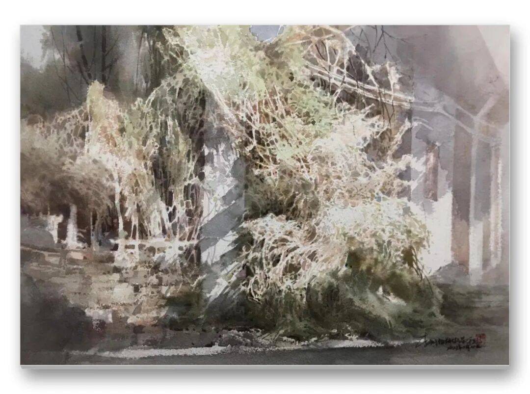 畫品即人品,先生的筆墨間,處處疊印著他的人生底色——開朗豁達(dá)的胸襟、飽經(jīng)歲月的厚重,化作凝重含蓄的色塊;詩人般的敏銳、山民般的淳樸,凝為靈動婉轉(zhuǎn)的線條。儒家的堅毅進(jìn)取與老莊的淡虛沉靜,在他的畫中悄然相融:一筆一畫的果敢,是入世的擔(dān)當(dāng);水色漫漶的隨性,是出世的從容。這種精神內(nèi)核,讓他的意象水彩探索走出了獨樹一幟的道路,所謂“舍近求遠(yuǎn)”,實則是不隨流俗、深耕本心的堅守,最終成就了新水彩的新品質(zhì)。