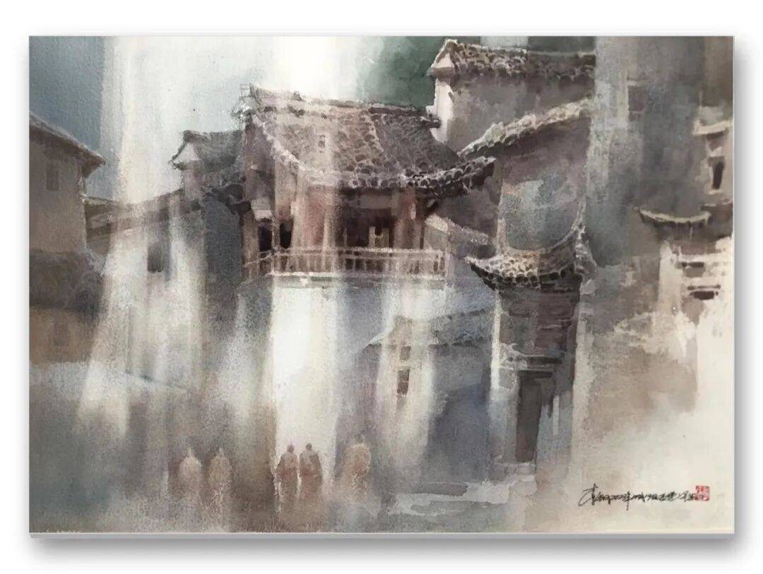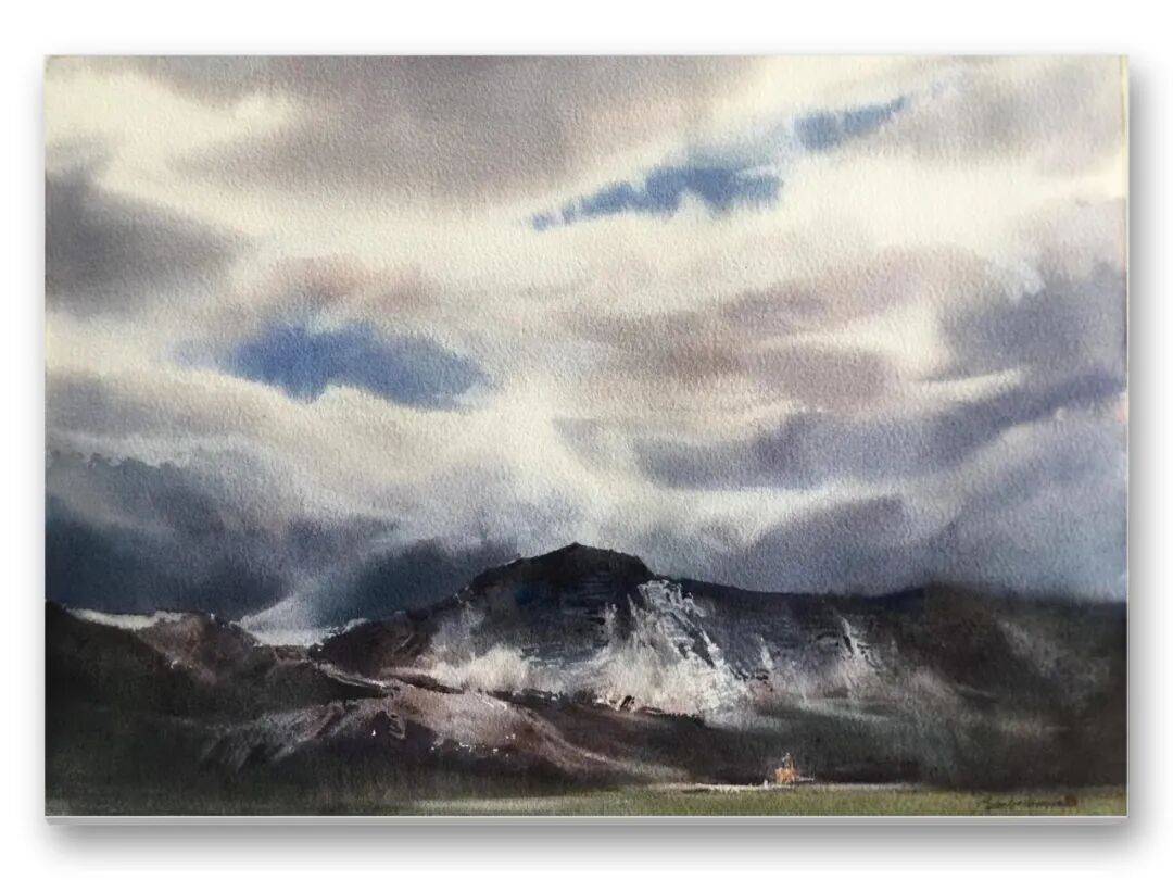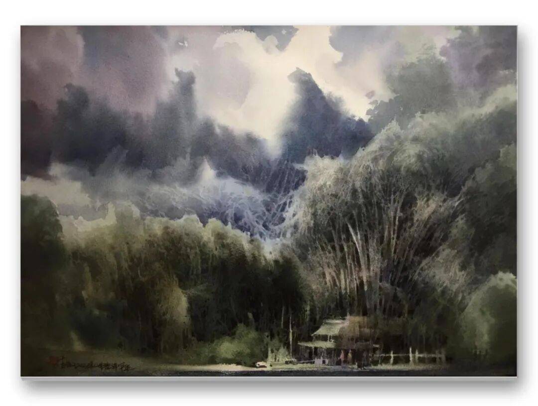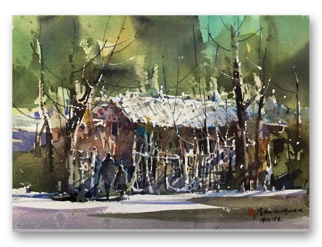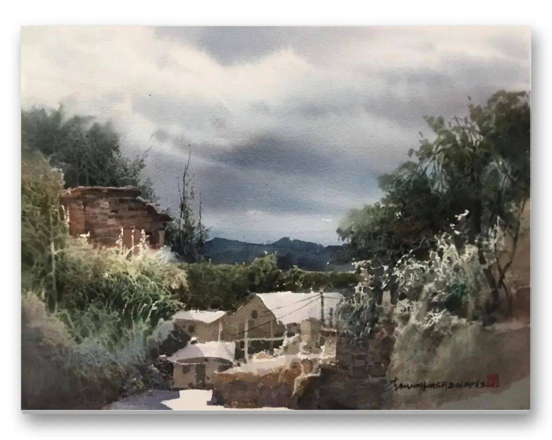 畫品即人品,先生的筆墨間,處處疊印著他的人生底色——開朗豁達(dá)的胸襟、飽經(jīng)歲月的厚重,化作凝重含蓄的色塊;詩人般的敏銳、山民般的淳樸,凝為靈動婉轉(zhuǎn)的線條。儒家的堅毅進(jìn)取與老莊的淡虛沉靜,在他的畫中悄然相融:一筆一畫的果敢,是入世的擔(dān)當(dāng);水色漫漶的隨性,是出世的從容。這種精神內(nèi)核,讓他的意象水彩探索走出了獨樹一幟的道路,所謂“舍近求遠(yuǎn)”,實則是不隨流俗、深耕本心的堅守,最終成就了新水彩的新品質(zhì)。