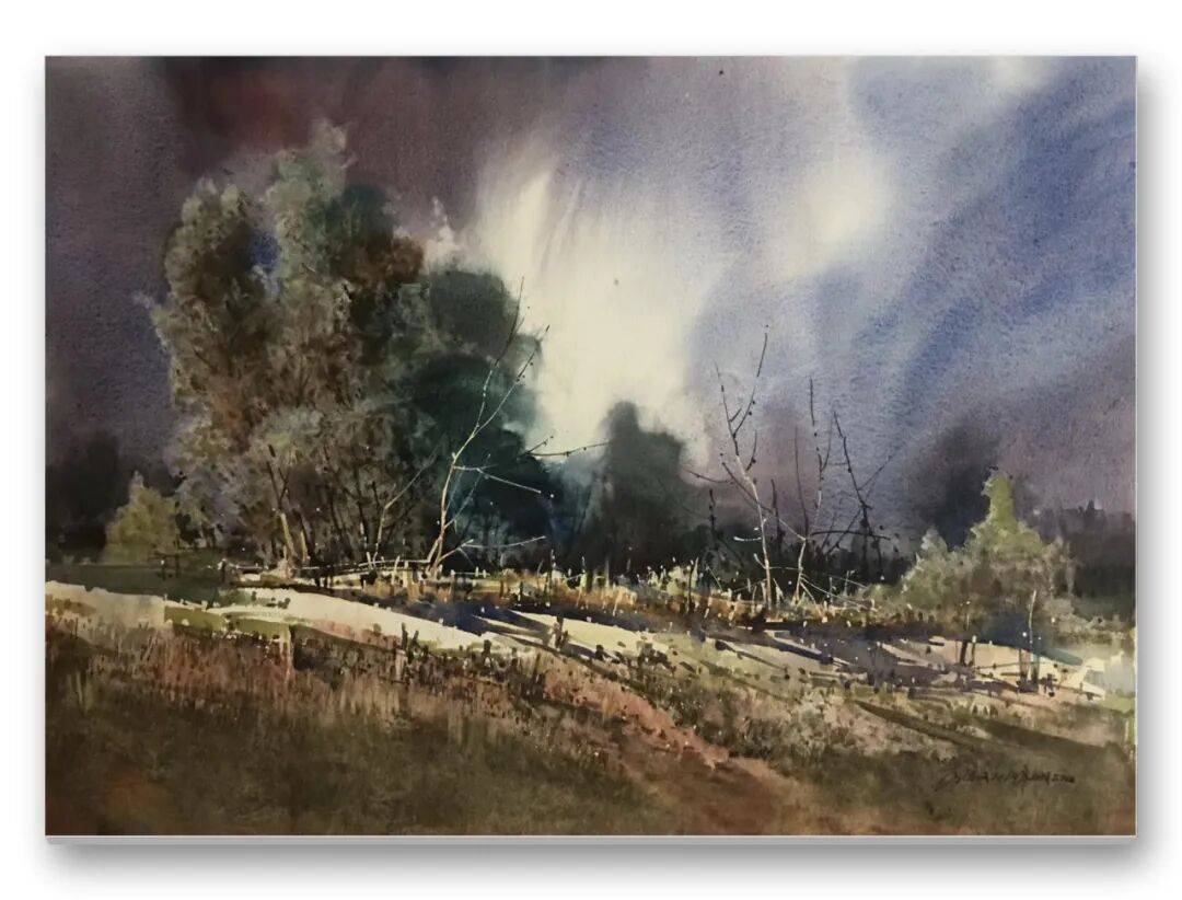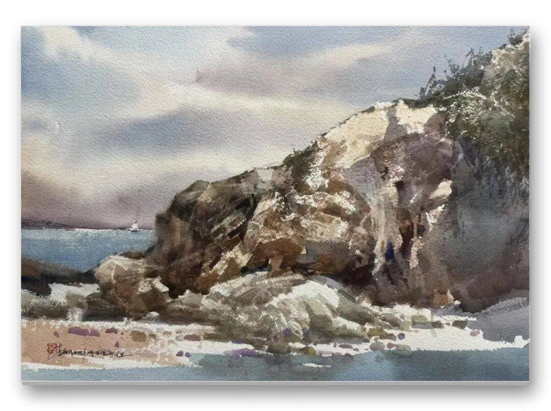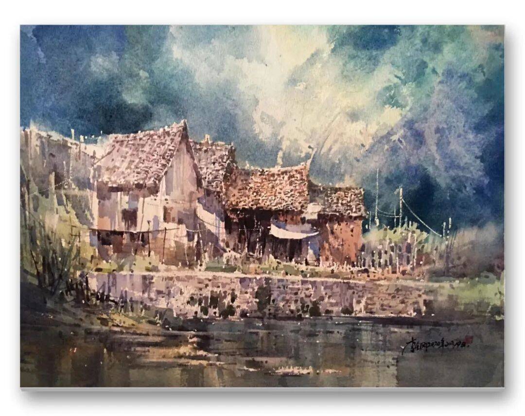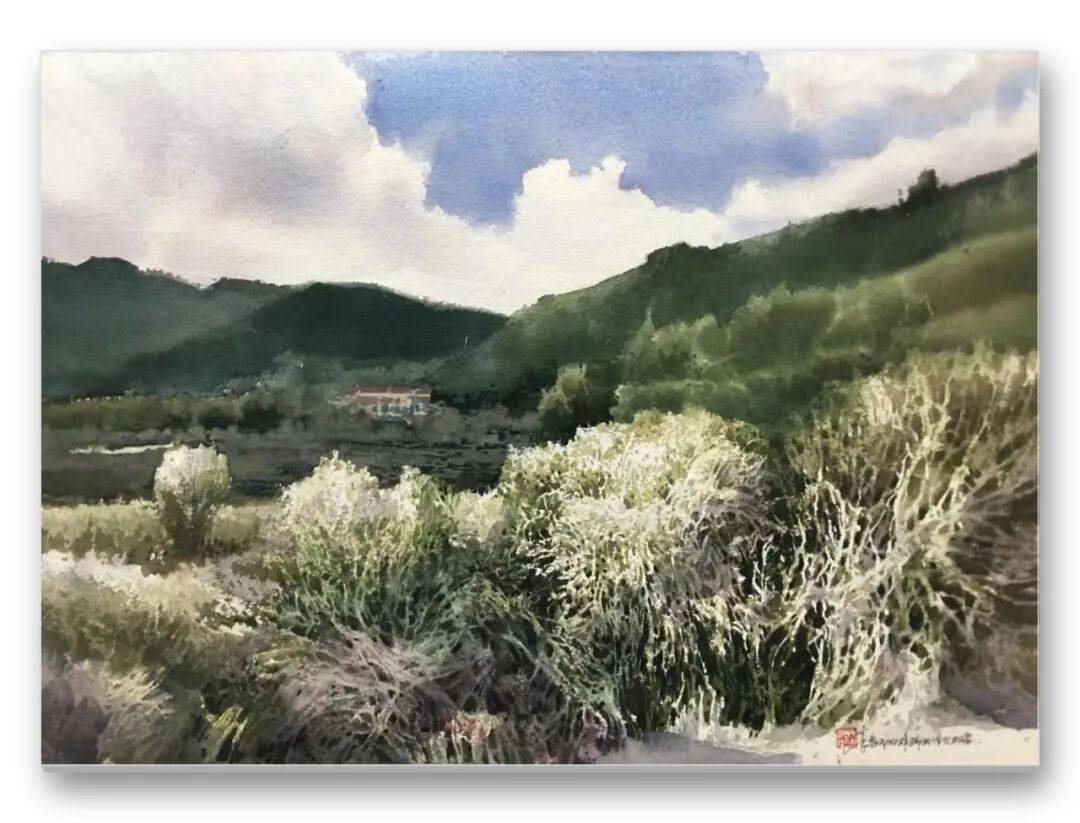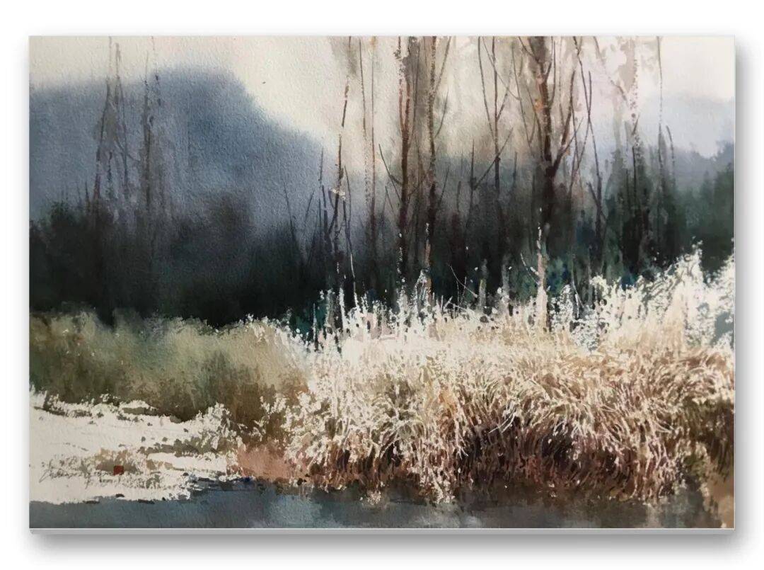 畫品即人品,先生的筆墨間,處處疊印著他的人生底色——開朗豁達(dá)的胸襟、飽經(jīng)歲月的厚重,化作凝重含蓄的色塊;詩人般的敏銳、山民般的淳樸,凝為靈動婉轉(zhuǎn)的線條。儒家的堅毅進(jìn)取與老莊的淡虛沉靜,在他的畫中悄然相融:一筆一畫的果敢,是入世的擔(dān)當(dāng);水色漫漶的隨性,是出世的從容。這種精神內(nèi)核,讓他的意象水彩探索走出了獨樹一幟的道路,所謂“舍近求遠(yuǎn)”,實則是不隨流俗、深耕本心的堅守,最終成就了新水彩的新品質(zhì)。