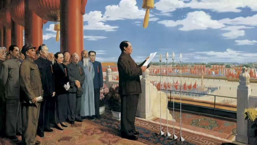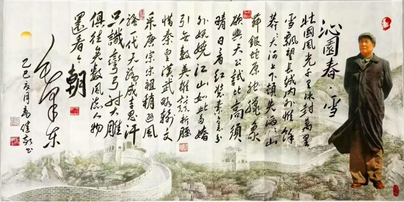 抗美援朝,跨江懾虎,五戰(zhàn)裂長空;衛(wèi)疆固土,戍邊靖境,三軍耀日月。聯(lián)大復(fù)席,五星耀乎聯(lián)合國廈;寰球棋變,華聲震于西洋東瀛。論十大之關(guān)系,調(diào)工農(nóng)之樞機(jī);立根本之大法,固國邦之宏基。九域歸心,萬民脫倒懸之苦;百年雪恥,四海頌再造之功。