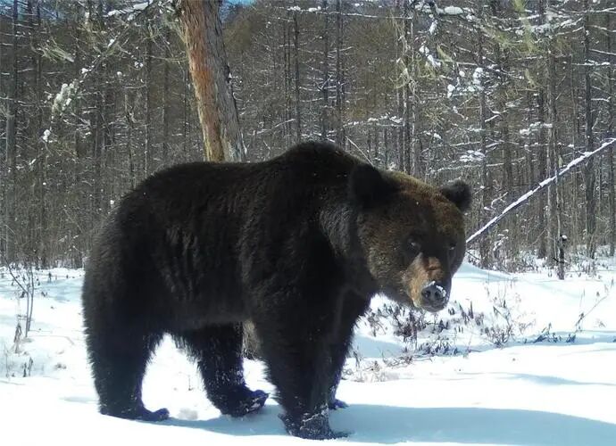 一天,我一個人帶把手槍上山摘桃子。爬到我們常去的那幾棵樹下,發(fā)現(xiàn)一片狼藉,地上到處是咬爛的桃子……這是誰干的呢?難道是藏民的牛?正想著就聽見樹上有動靜,原來一頭狗熊就在我頭頂?shù)臉渖?,我大吃一驚!急忙往下風(fēng)方向躥出了十來米,躲到一座大石頭后,再回頭觀察樹上的狗熊。樹上那頭熊,好像也沒拿我當(dāng)回事,只管在樹上使勁地搖晃樹枝,成熟的桃子雨點般落了一地…… 差不多了,只見它向下滑了一段后,側(cè)身吊著樹丫晃了晃,四腳一四仰八叉地掉了下來,“砰”的一聲,像一大坨肉墩掉到了樹下……只見它翻身起來就在地上大快朵頤吃了起來,桃汁順嘴而流。吃了好一陣,肚子脹鼓鼓地站起來,扭頭向我這邊張望,嚇得我趴在地上大氣都不敢喘。它觀察了一陣,見我還算老實,于是拍拍肚皮,大大咧咧地轉(zhuǎn)身進了密林中……