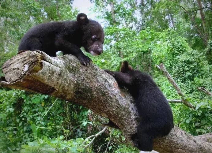 走近一看,原來是兩只狗熊幼崽在路邊草坪上戲耍……大家一時好奇,遠遠地趴在地上觀察。怎么不見大熊呢?會不會是被遺棄了的孤兒???負責(zé)煮飯的老劉正好帶有半袋黃蘿卜,他揣了幾根蘿卜輕腳輕手地走近小熊,摸出兩根蘿卜輕輕遞了過去,兩個小家伙立即過來搶……老劉一邊走一邊往地上丟蘿卜,兩只小熊跟著他一直走到了我們做飯的帳篷里。于是大家擠過來看,兩個小家伙只顧吃蘿卜并不怕我們。不一會兒肚子吃得圓滾滾的,半袋蘿卜也吃得差不多了,就在帳篷里玩??粗鼈z呆頭呆腦的萌樣子,大家興奮極了。第二天一大早,老劉要回住地拉輔食和蔬菜,大家也要上工地伐木。老劉就用背包帶把這兩個小家伙拴起來關(guān)在帳篷里。