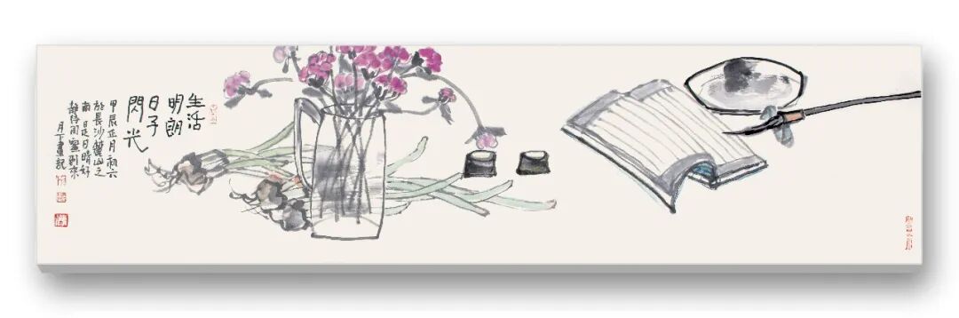 月下作畫不喜歡太正式。她作畫總是隨性、隨心、隨機而動,也從不打草稿,因而畫中盡是天趣、天機,率性的筆墨在運動中充滿了不確定因素,或濃或淡,時而用線時而潑墨、時而賦彩,靈動可人。在她畫中的長短句題款里,能夠讀出她內心對這世界充滿溫情和暖意,即使有時傷感,也是用美好來呈現(xiàn),因為她心中透著滿滿的陽光。