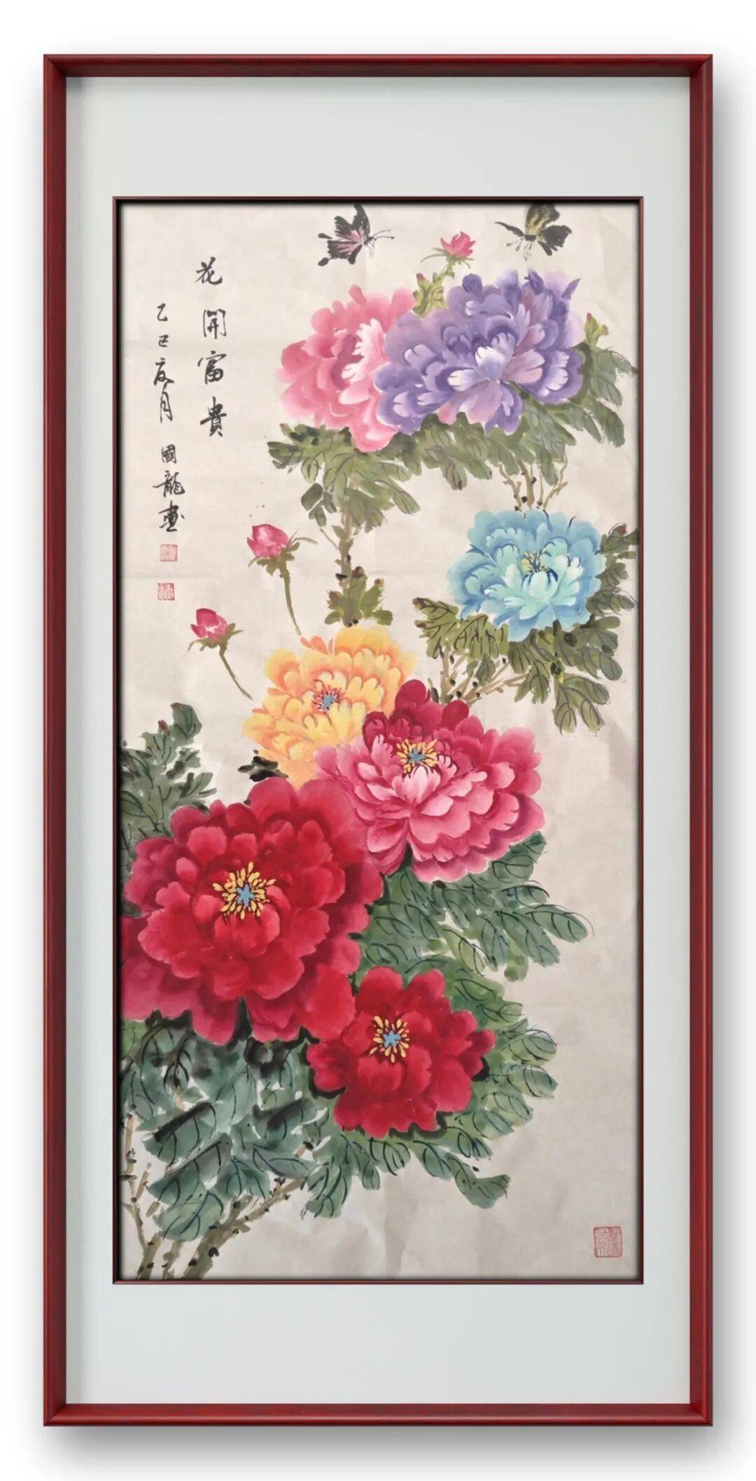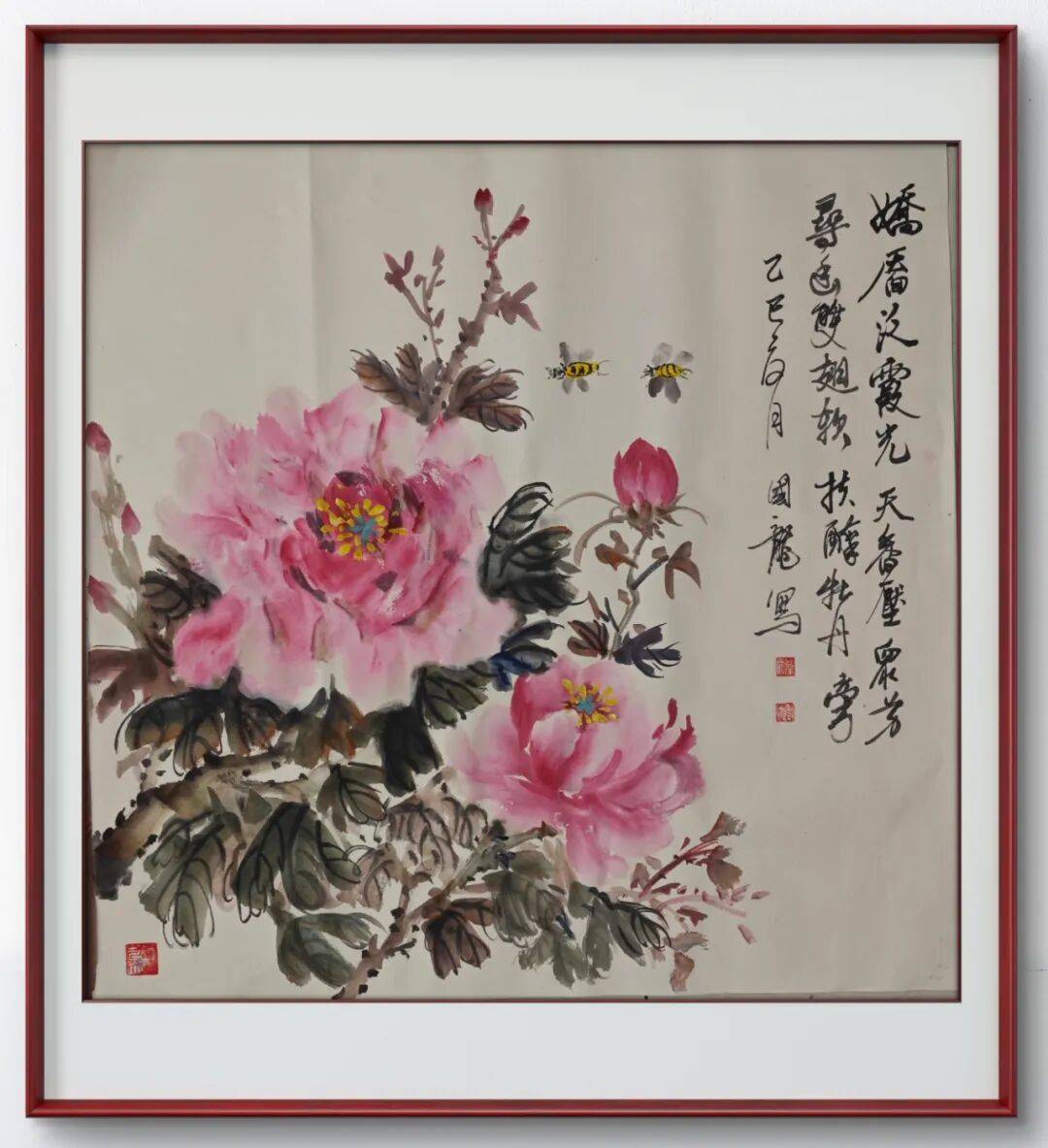 牡丹畫(huà)作為傳統(tǒng)吉祥題材,翟國(guó)龍筆下的牡丹卻獨(dú)具韻味。他摒棄了俗常的濃艷浮華,筆下牡丹或雍容華貴,或清雅脫俗,花瓣層層疊疊,筆觸細(xì)膩溫潤(rùn),設(shè)色濃淡相宜,既凸顯了牡丹“花中之王”的端莊氣度,又暗含了“富貴不驕”的文人風(fēng)骨。枝葉的勾勒蒼勁有力,與花瓣的柔美形成鮮明對(duì)比,剛?cè)岵?jì)間盡顯牡丹的生機(jī)與神韻,打破了傳統(tǒng)牡丹畫(huà)的程式化束縛,賦予其全新的藝術(shù)生命力。