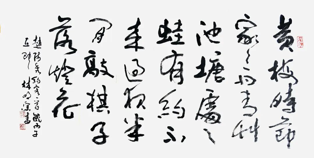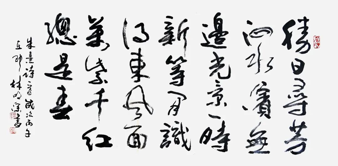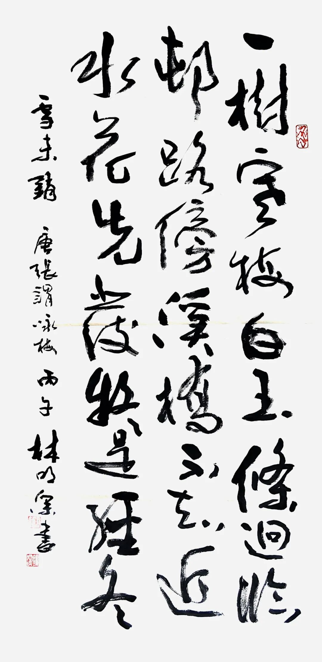林明深最為人稱道的藝術(shù)特質(zhì),在于其“詩(shī)書合璧”的文人品格。在詩(shī)心漸失的當(dāng)代書壇,他堅(jiān)持自作詩(shī)詞入翰墨,令文思與筆意共舞生輝。其自作詩(shī)“游船載夢(mèng)水迢迢,兩岸虹光過(guò)影橋。今日羊城真美景,地標(biāo)更有小蠻腰”,在書法創(chuàng)作中完美呈現(xiàn)了高超的文學(xué)修養(yǎng)與藝術(shù)境界。文辭的平仄化作線條的疾徐,詩(shī)境的開拓轉(zhuǎn)為章法的虛實(shí),這種“以詩(shī)養(yǎng)書,以書載道”的創(chuàng)作理念,使他的作品超越單純的技藝層面,成為士大夫精神的當(dāng)代回響。