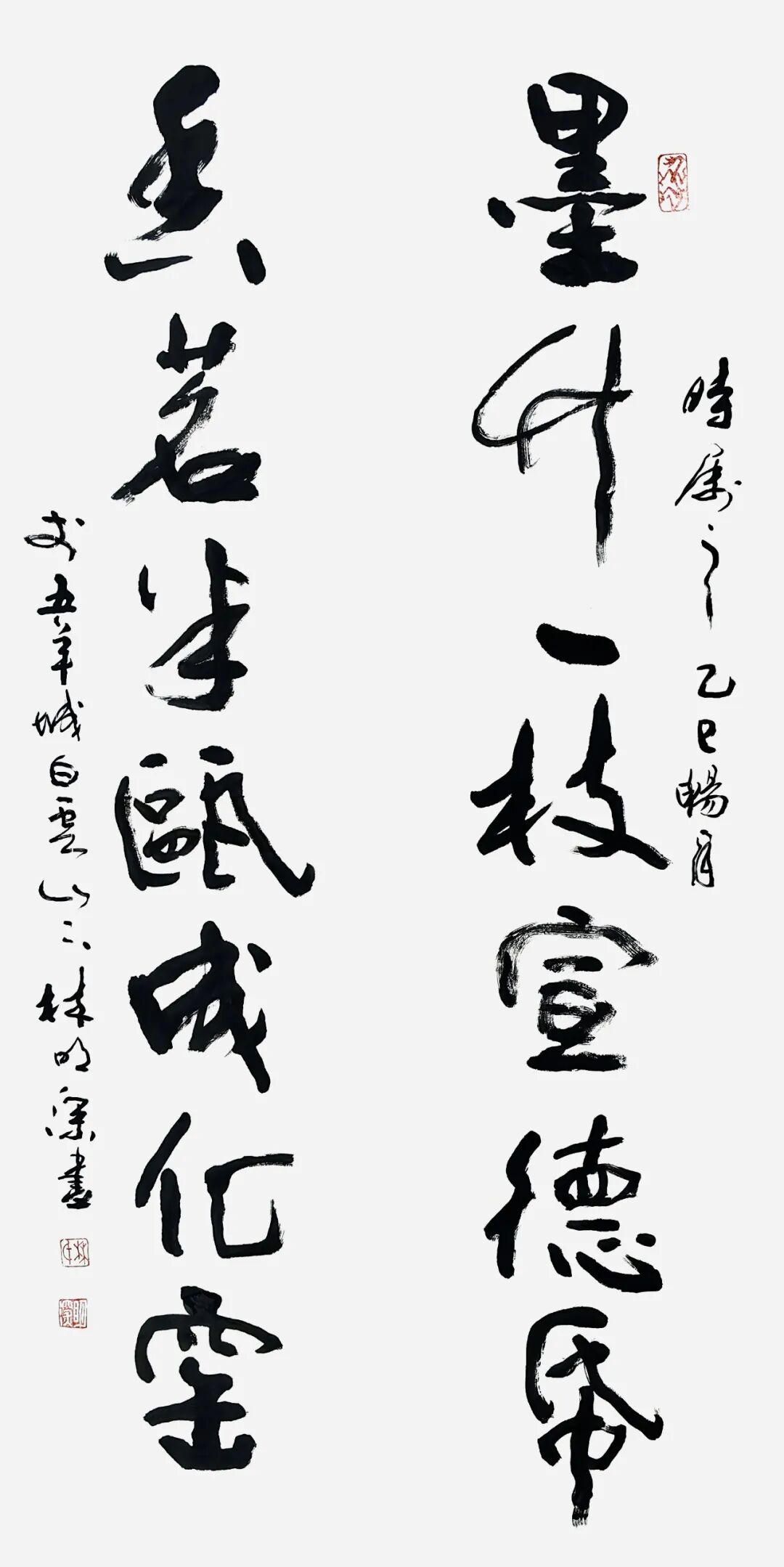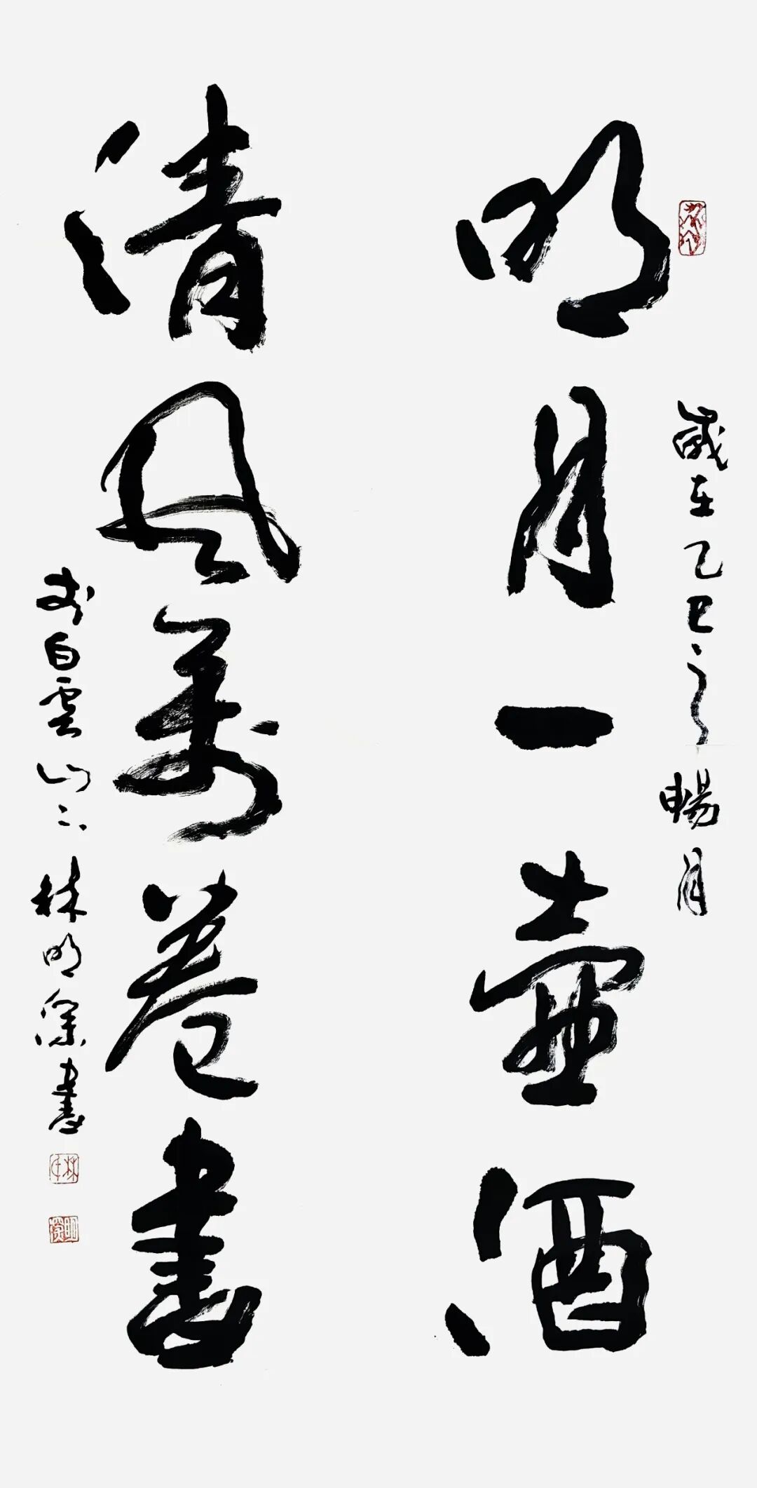林明深的書法藝術(shù),根植于中華傳統(tǒng)文化的正脈。他取法二王風(fēng)雅,兼融米芾之跳宕、蘇軾之渾厚,在筆鋒起落間構(gòu)筑出獨(dú)特的韻律美學(xué)。觀其行草作品,如天地交響:起筆勁健如壯士拔劍,筋骨錚然;運(yùn)筆澀進(jìn)若老藤盤空,氣韻排宕;結(jié)體疏密有致,動(dòng)靜相生,深得“書肇自然”之妙。尤為精絕者在于其牽絲引帶處,如《鼎湖山記》中“云”字末筆的三疊飛白,熔漢簡(jiǎn)古意與現(xiàn)代構(gòu)成于一爐,展現(xiàn)出非凡的藝術(shù)膽魄與創(chuàng)新精神。