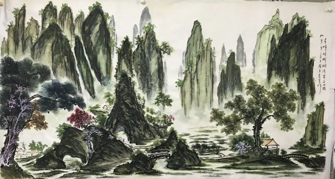 真正讓陳書略山水畫脫穎而出的,是其“中西結(jié)合”的創(chuàng)新探索,尤其是對色彩的大膽運(yùn)用。傳統(tǒng)山水多以水墨為宗,色彩常作輔助,而他卻打破這一慣例,如作品《深山藏福音》將西方繪畫中對色彩層次、光影效果的把控,融入中式山水的筆墨框架中,造就出“濃烈豐富”的色彩效果。如作品《嶺南春色》這種融合絕非簡單的“水墨加色彩”,而是讓色彩與筆墨相互成就:墨色的濃淡為色彩鋪墊了層次,色彩的飽和又為山水注入了鮮活生命力,既避免了傳統(tǒng)水墨可能的單調(diào),也規(guī)避了西方色彩易顯的浮躁,讓山水既有“墨分五色”的雅致,又有視覺上的沖擊力,仿佛讓觀者能透過畫面,觸摸到山河的厚重肌理與鮮活氣息。