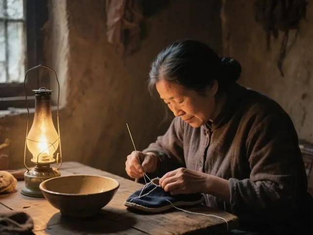 夜半我迷迷糊糊醒來,見您咬著線頭,對著昏黃的燈光瞇眼穿針——一次,兩次……鼻尖沁出細密的汗珠。