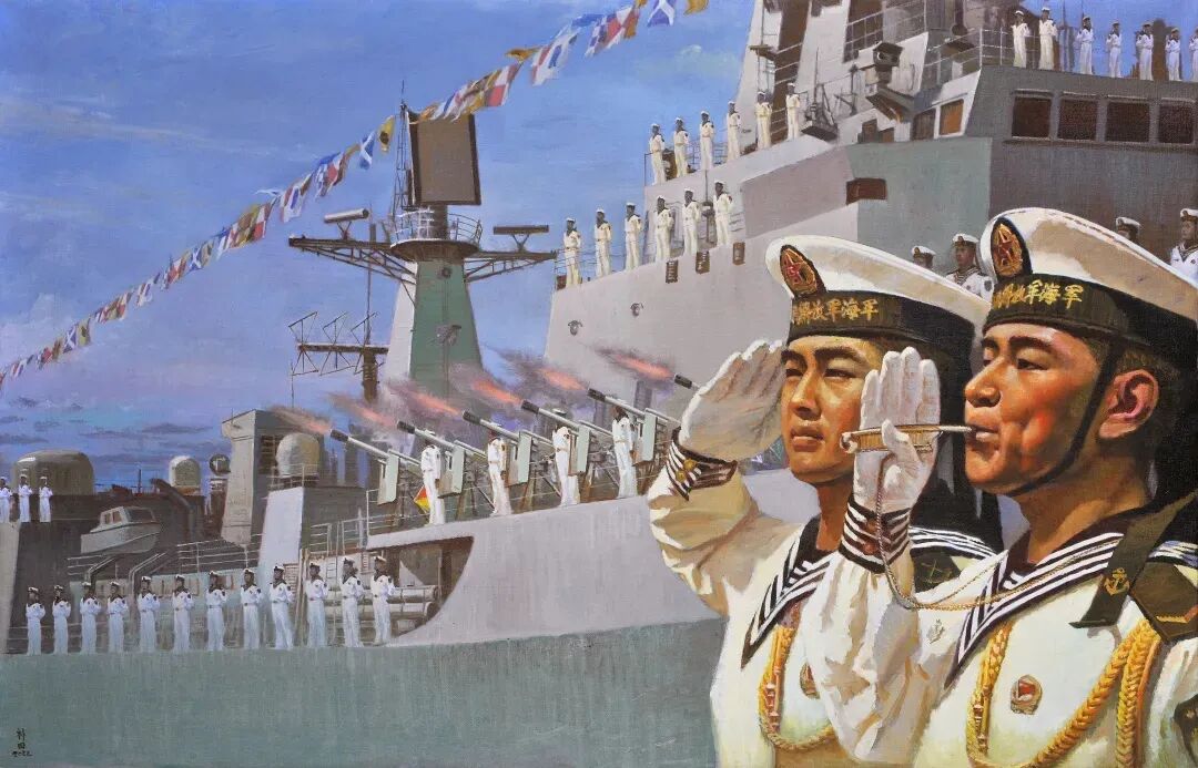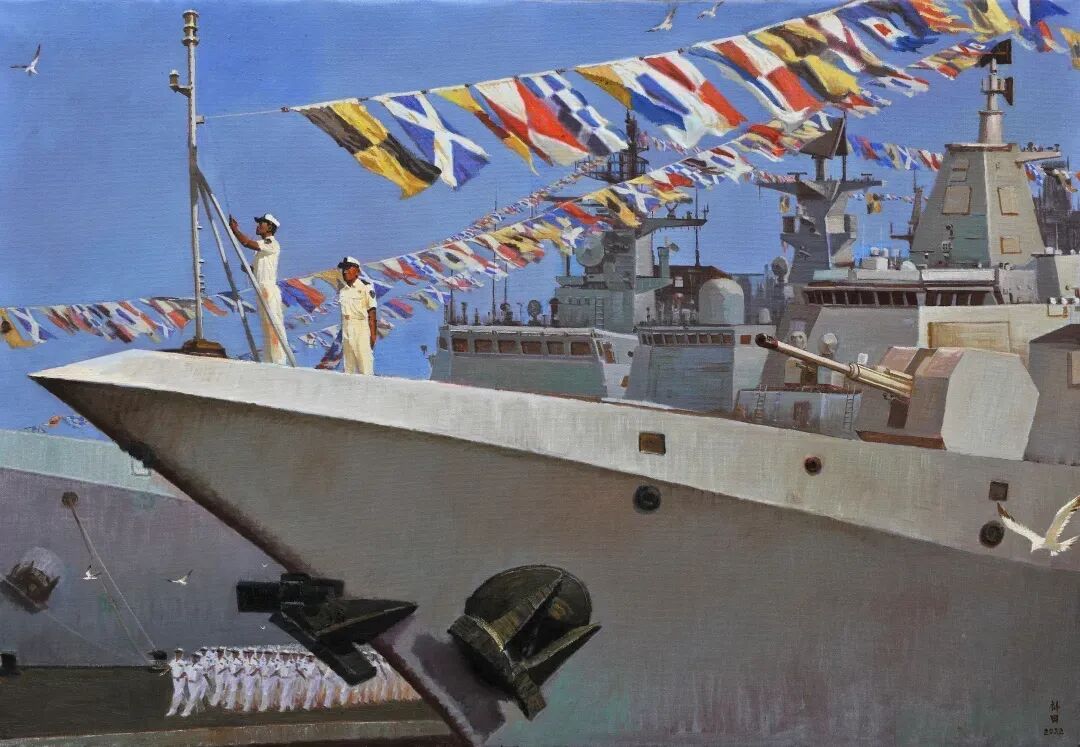 這位有著深厚生活積淀與真摯情感的畫家,擅長以多元技法表現(xiàn)題材:艦隊在波濤中破浪前行,浪花碰撞間仿佛有聲響回蕩,水兵的堅毅與豪邁在筆觸間熠熠生輝。他用畫筆為最可愛的水兵立傳,讓他們的赤誠情懷與奉獻(xiàn)精神跨越時空,鼓舞著每一位觀者。