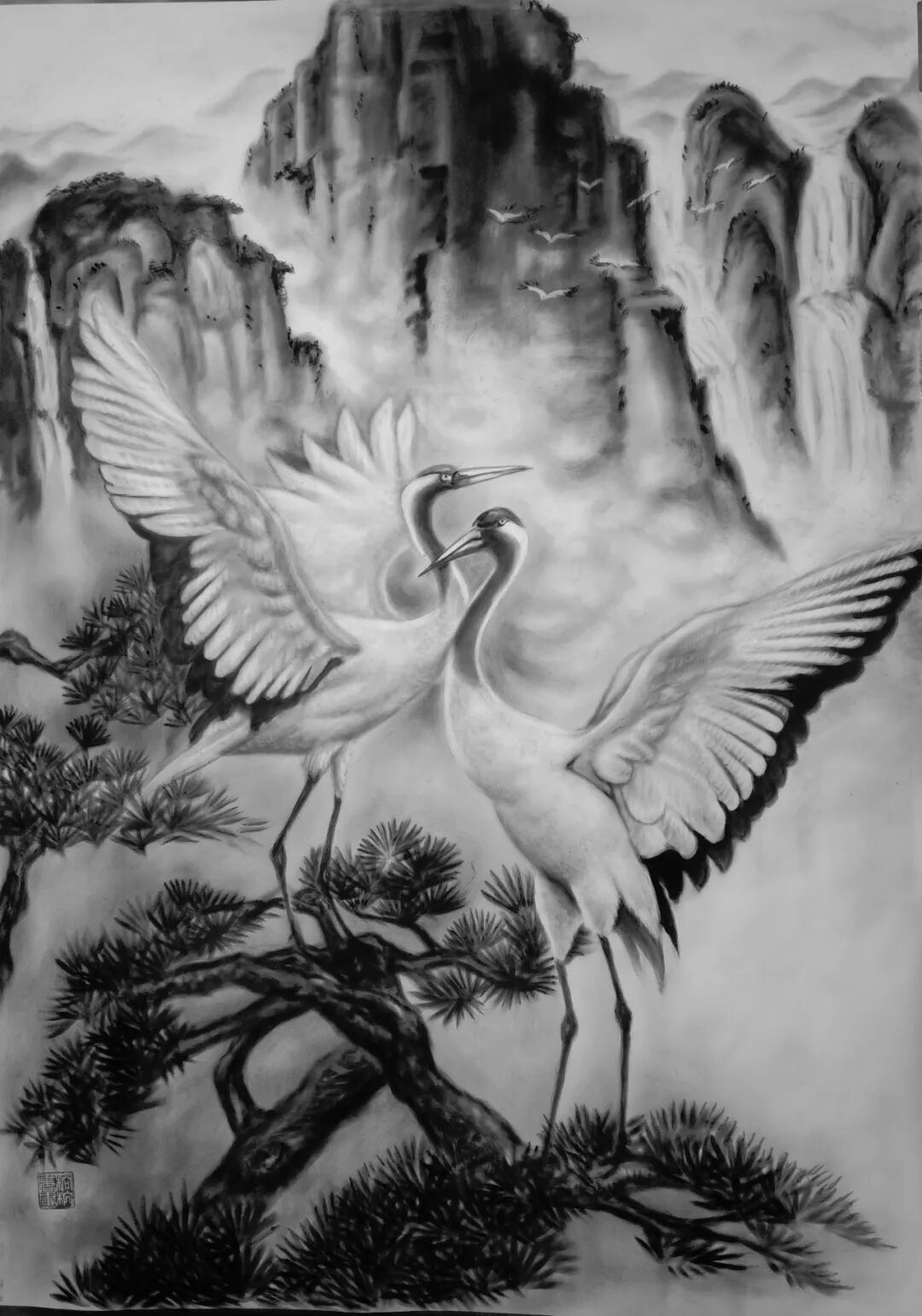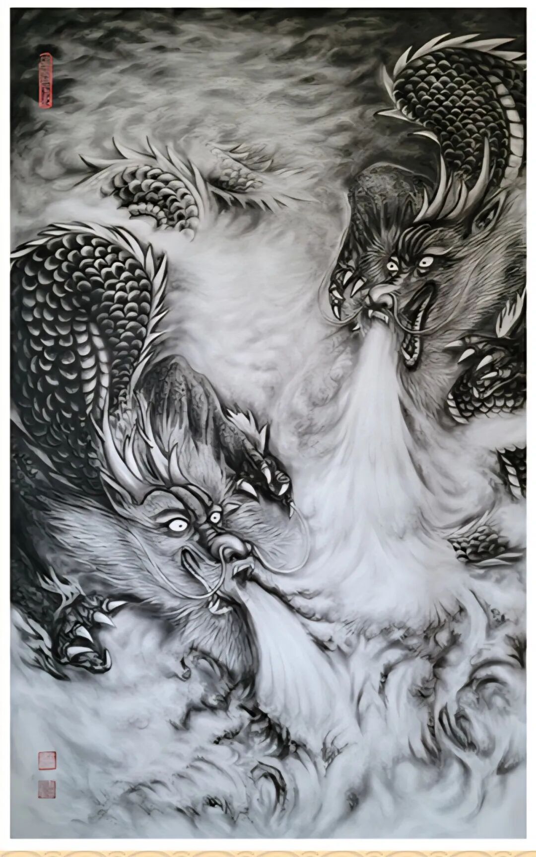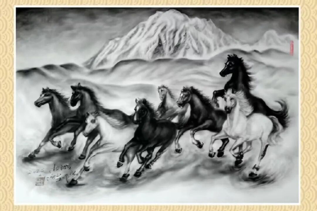 這絕非一次簡單的技法改良,而是一場由國家知識產(chǎn)權(quán)局鄭重背書的文化功勛。張松柏獨(dú)創(chuàng)的粉墨畫,徹底摒棄了水的暈染與油的調(diào)和,直接以特種礦物炭粉與天然寶石顏料為血肉,以宣紙、絲絹為載體,通過千萬次實(shí)踐練就的“干畫”絕技,讓畫面達(dá)到了 “巨幅不失神韻,微毫盡顯精神” 的至高境界。