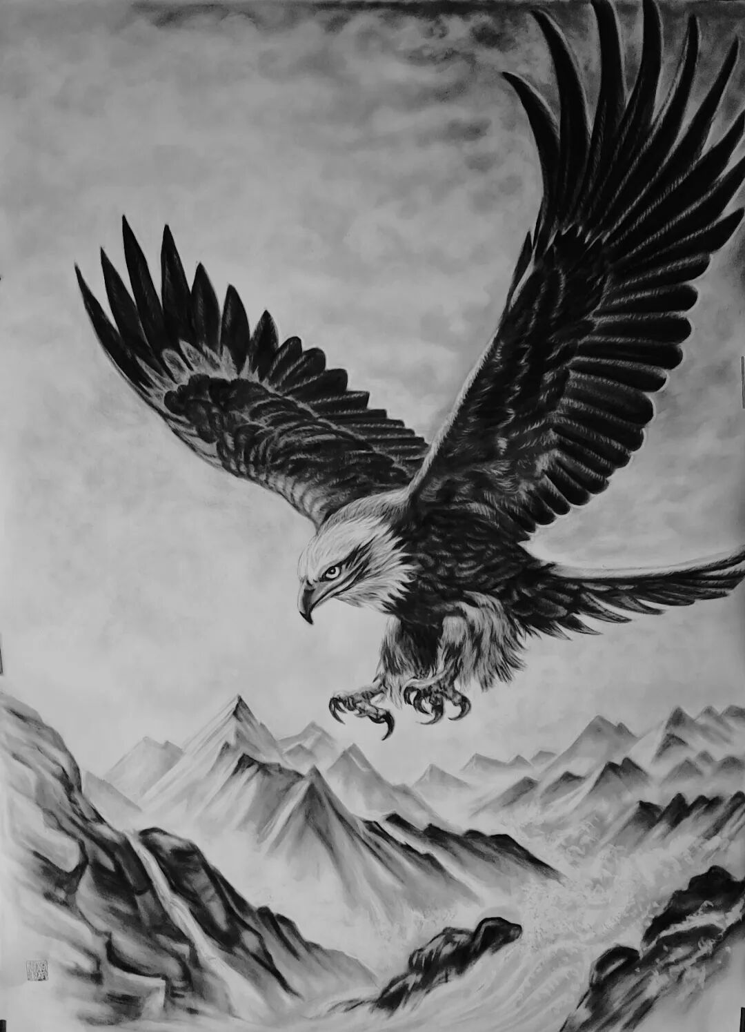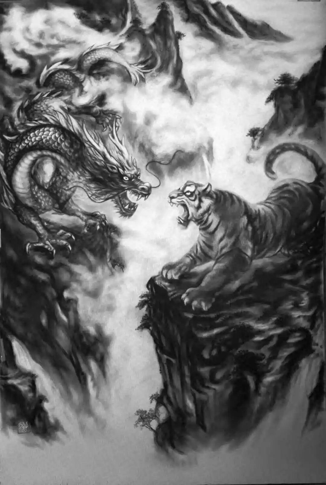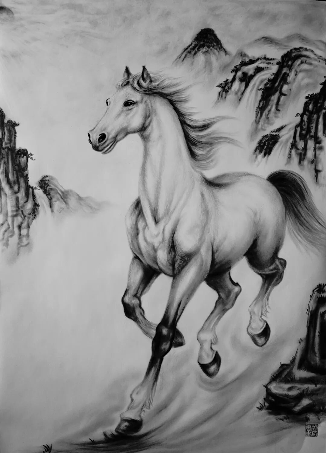 這絕非一次簡單的技法改良,而是一場由國家知識產(chǎn)權(quán)局鄭重背書的文化功勛。張松柏獨(dú)創(chuàng)的粉墨畫,徹底摒棄了水的暈染與油的調(diào)和,直接以特種礦物炭粉與天然寶石顏料為血肉,以宣紙、絲絹為載體,通過千萬次實(shí)踐練就的“干畫”絕技,讓畫面達(dá)到了 “巨幅不失神韻,微毫盡顯精神” 的至高境界。