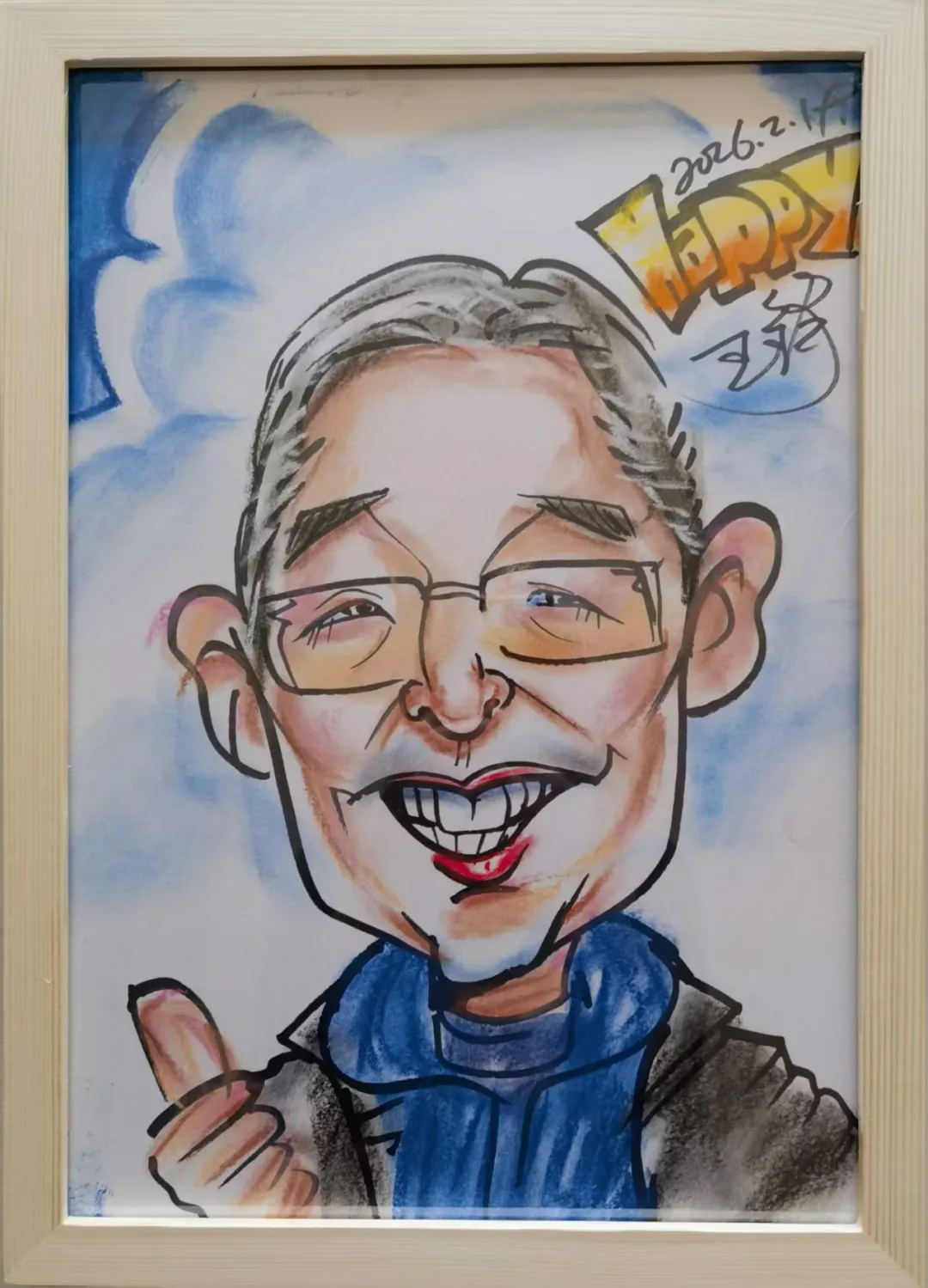 又想起生活廳角落里有個(gè)畫家現(xiàn)場(chǎng)作畫,不知下午還在不。趕緊過去:給俺畫一張漫畫,盡管夸張點(diǎn),藝術(shù)就需要夸張。歘欻欻,齊活:不錯(cuò),再瘦點(diǎn)就是馬三立了J