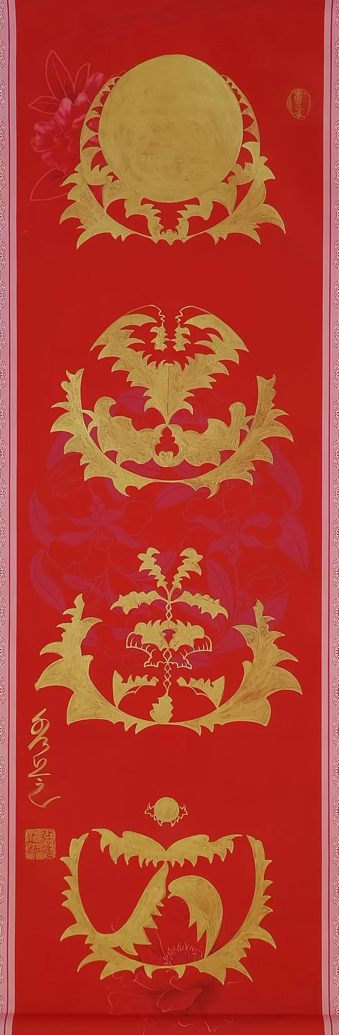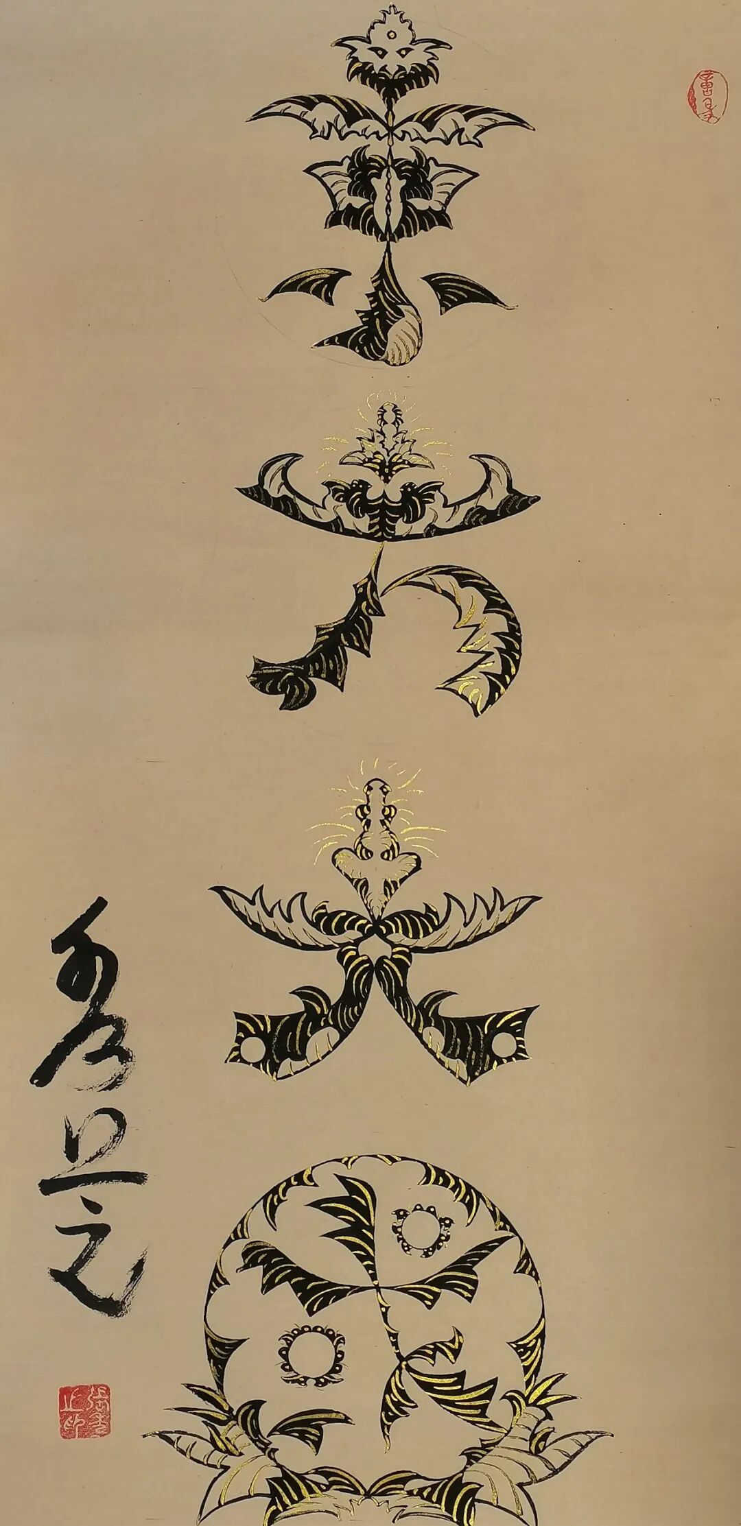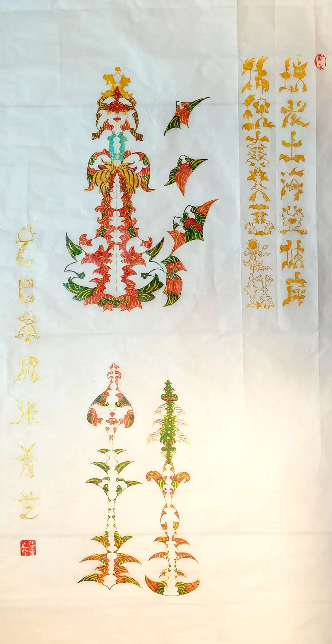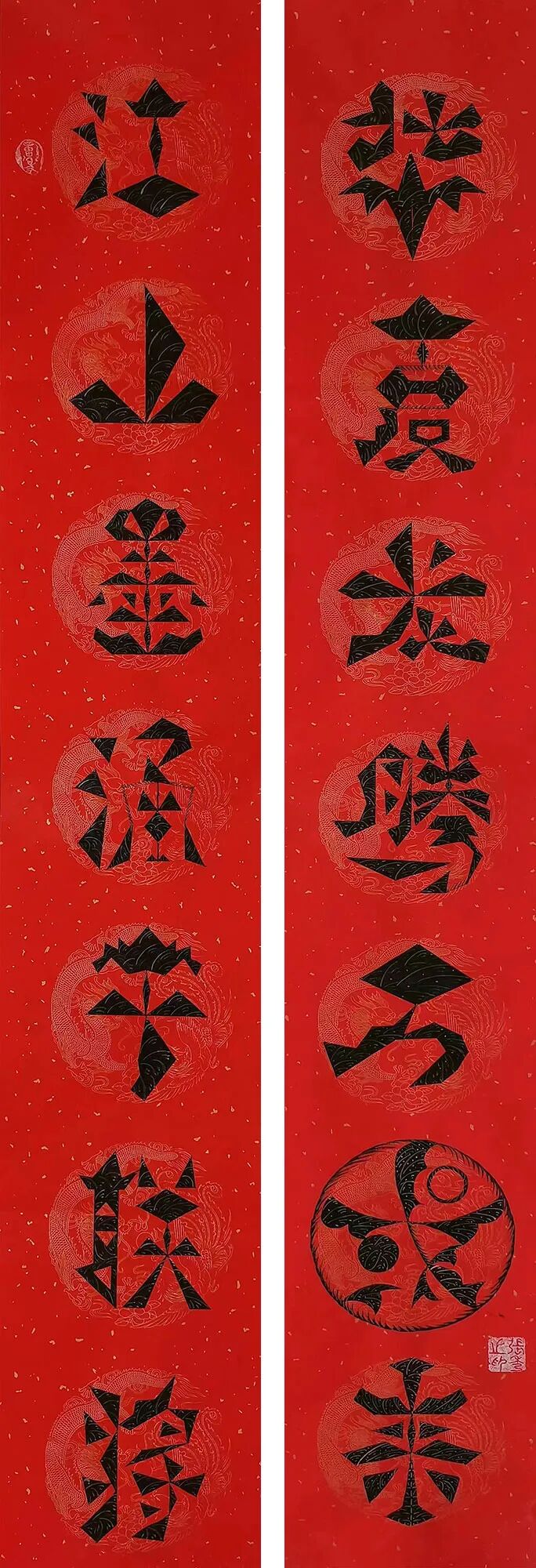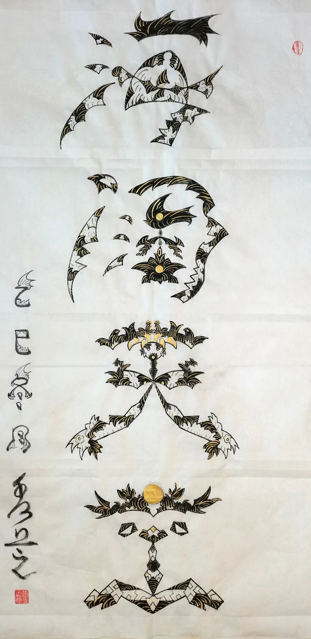 她的筆墨革新絕非尋常,而是以哲思為骨、信仰為魂的藝術(shù)覺醒。佛經(jīng)偈語與道家經(jīng)典在其筆下化作躍動(dòng)的符號(hào),四屏中堂宛如靈符,字中有畫、畫中藏讖,既承襲甲骨文的象形基因,又注入當(dāng)代人對(duì)吉祥寓意的精神渴求。藏家懸其墨寶于廳堂,竟覺屋內(nèi)氣流和暢,心緒漸寧,這正是其人宇合一理念的玄妙再現(xiàn),意象作品通過視覺共振激活人體能量場,讓書法超越賞玩,成為調(diào)和命理、滋養(yǎng)身心的文化法器。