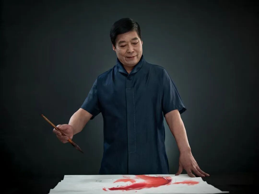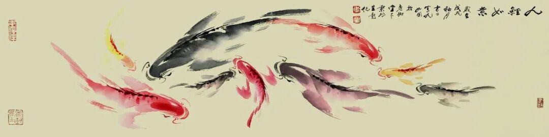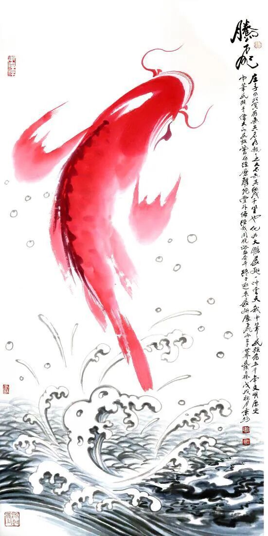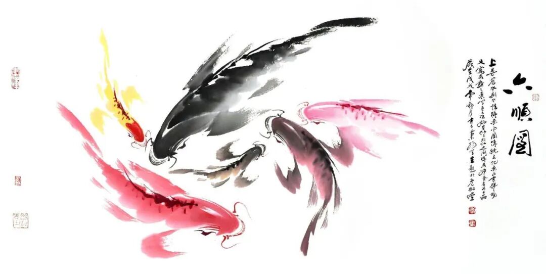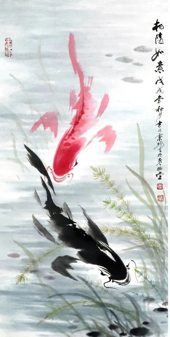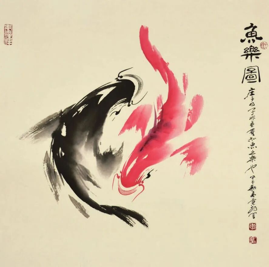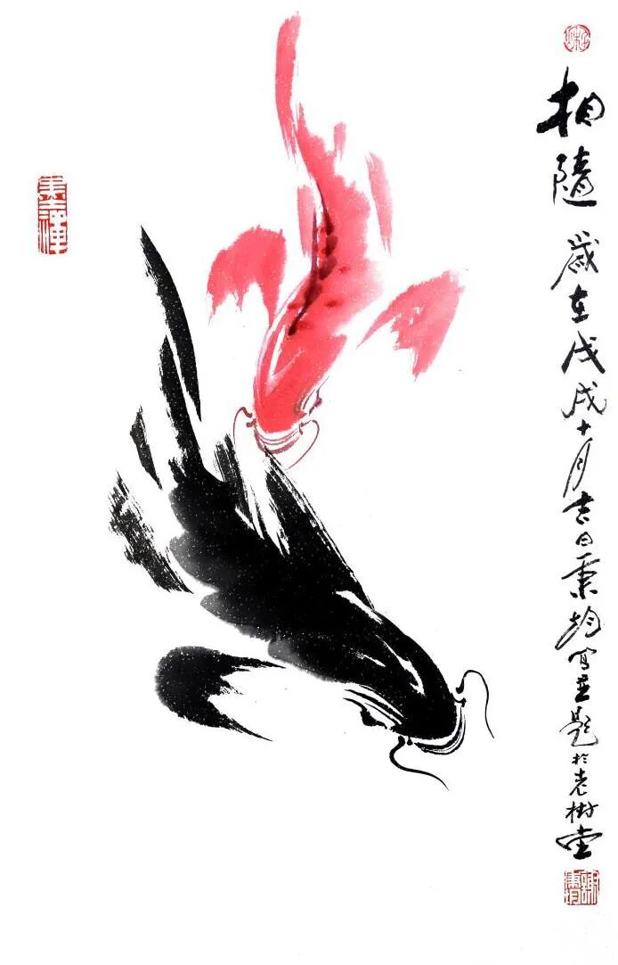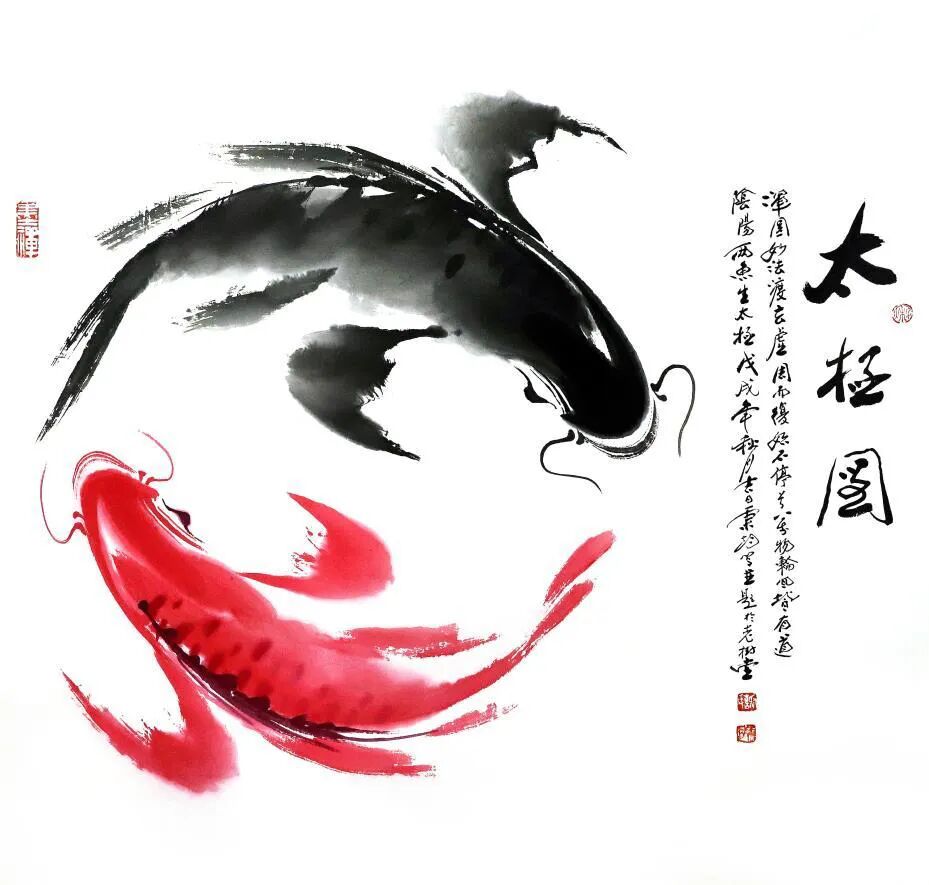再觀謝秉均先生的寫意水墨魚畫,乃是以筆墨參悟道法之妙境的生動體現!筆下大多是雙魚環(huán)伺,一黑一紅,相逐相生,宛若太極圖式般流轉不息,黑魚墨韻渾厚,如坤德承載萬物;紅魚則染朱砂靈動,似乾元貫注生機。如此陰陽互濟、虛實相生之境,可謂早已是超越了物象摹寫之藩籬,取而代之的,則是一種由技入道的精神冥合!以氣馭筆,凝神運腕,游魚悠然自得,眾幅畫作,實屬謝秉均先生道法自然、參悟道學循環(huán)往復之玄機的真實印證!