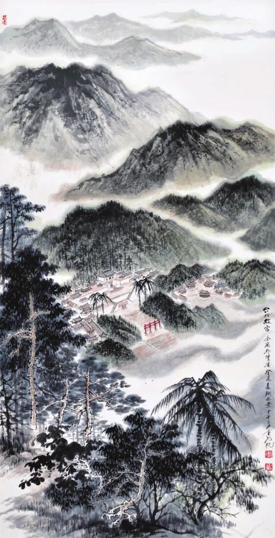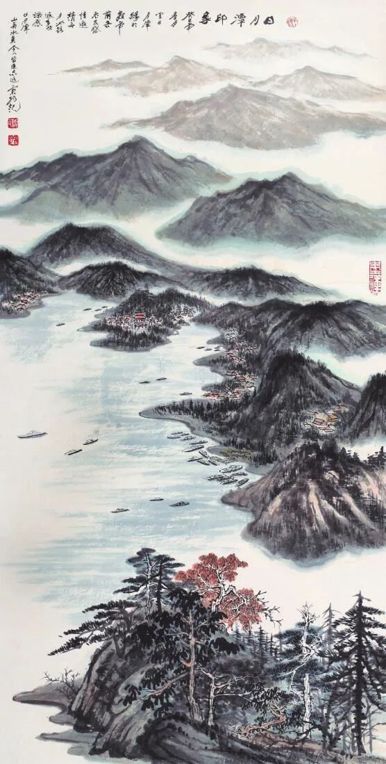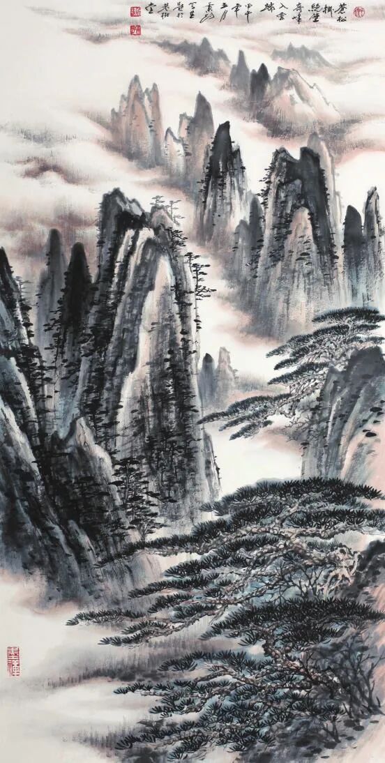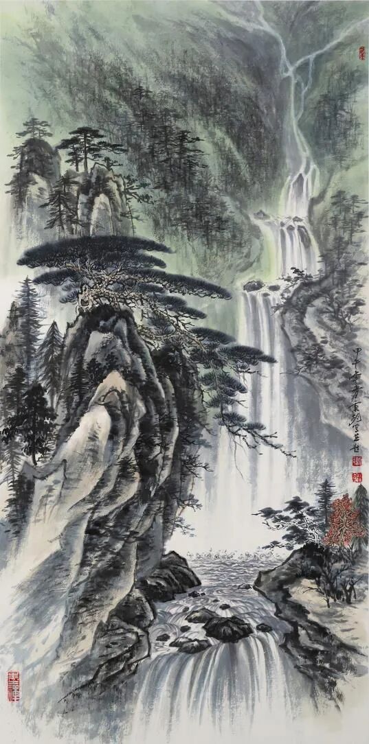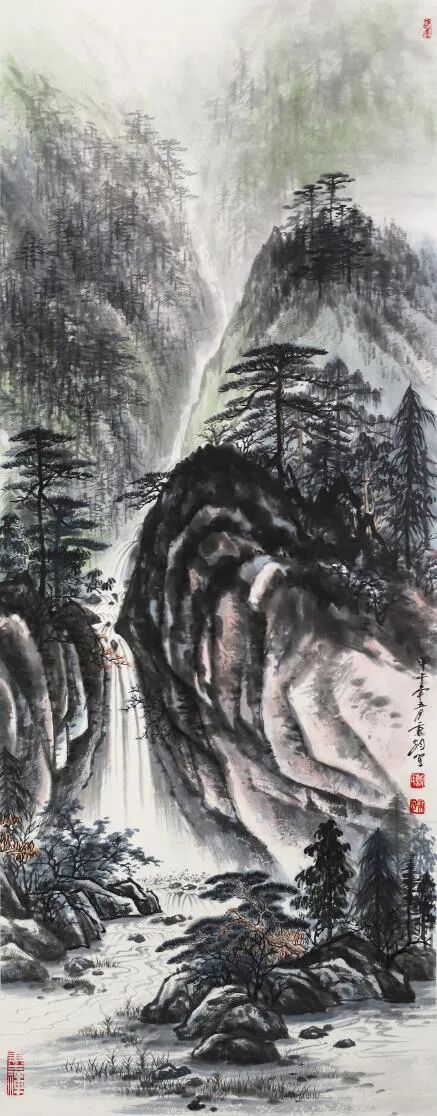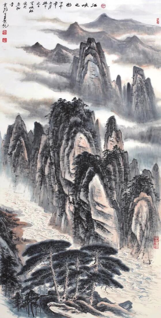 又見其眾幅山水佳作,畫中清氣盈動,尤得文人避世致虛、守靜致篤之妙。譬如此幅《江峽之韻》,于豎幅間盡顯天地造化之機,奇峰聳峙,直破云靄,萬壑層疊,隱現陰陽。勢之險絕,恍若太華削成一般,令人頓生仰止之嘆!筆墨氤氳處,則以留白恰成云煙吞吐之態(tài),近水長河經山峽而奔騰不息,似聞雷鳴水嘯,遠山無皴因墨韻而自然暈化,尤見群山含黛,更有青松傲立于巖隙,曲徑蜿蜒入幽深。通幅不著雜色,獨以水墨濃淡交織蒼秀之美,一股高逸之氣貫穿始終,堪稱滌人心目之佳作也!