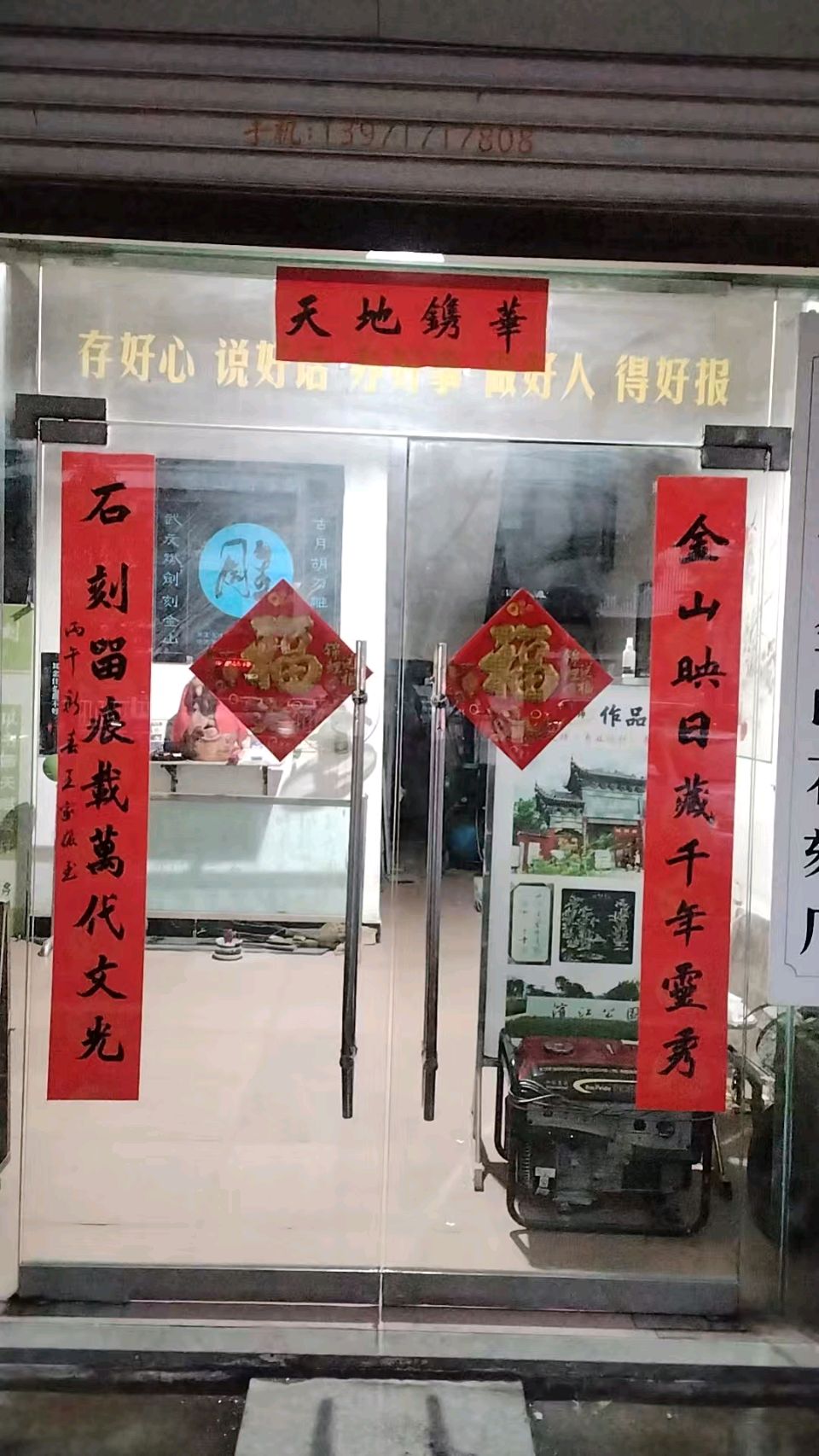 此聯(lián)由武穴著名書畫家王家振先生于丙午年春節(jié)專為胡斌“金山石刻”題寫。上聯(lián)以“金山映日”喻事業(yè)生輝,藏山水靈氣與歲月底蘊;下聯(lián)以“石刻留痕”贊藝術(shù)傳世,載文化光芒與歷史厚重。聯(lián)語大氣典雅、意境開闊,既點出店名,又升華雕刻之文化價值,堪稱門面點睛之筆。