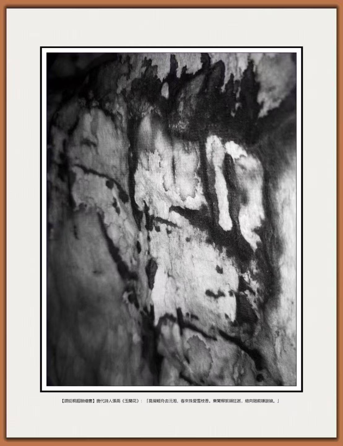 畫面下方的題字是張喬的詩,楷書工整卻帶著靈動,像一根線,把抽象的畫與具體的詩連起來?!澳獢M輕舟去沅湘”:畫面里的黑色紋理像沅湘的水流,從底部向上蔓延,仿佛在邀請觀眾去漂泊,但白色斑塊的存在卻像拒絕,它不隨波逐流,而是固定在黑色里,告訴人們拒絕世俗的漂泊,堅守精神的本真?!按簛硎鈵垩┲ο恪保喊咨邏K像春的使者,在黑色的冬里綻放,它的香不是嗅覺的,而是視覺的,當(dāng)你凝視它,會突然想起玉蘭花的清香,想起春天的風(fēng),想起某種干凈的感覺,像精神的氣息撲面而來。“東闌柳絮顛狂甚,總向階前賺謝娘”:黑色紋理像顛狂的柳絮,試圖覆蓋白色,比如畫面右側(cè)的黑色向白色長條蔓延,卻最終失敗,白色依然明亮,黑色只能成為背景。詩的諷刺與畫的對比在這里共鳴,世俗的顛狂永遠(yuǎn)無法掩蓋高潔的光芒,柳絮的獻(xiàn)媚永遠(yuǎn)比不上雪枝的純粹。
