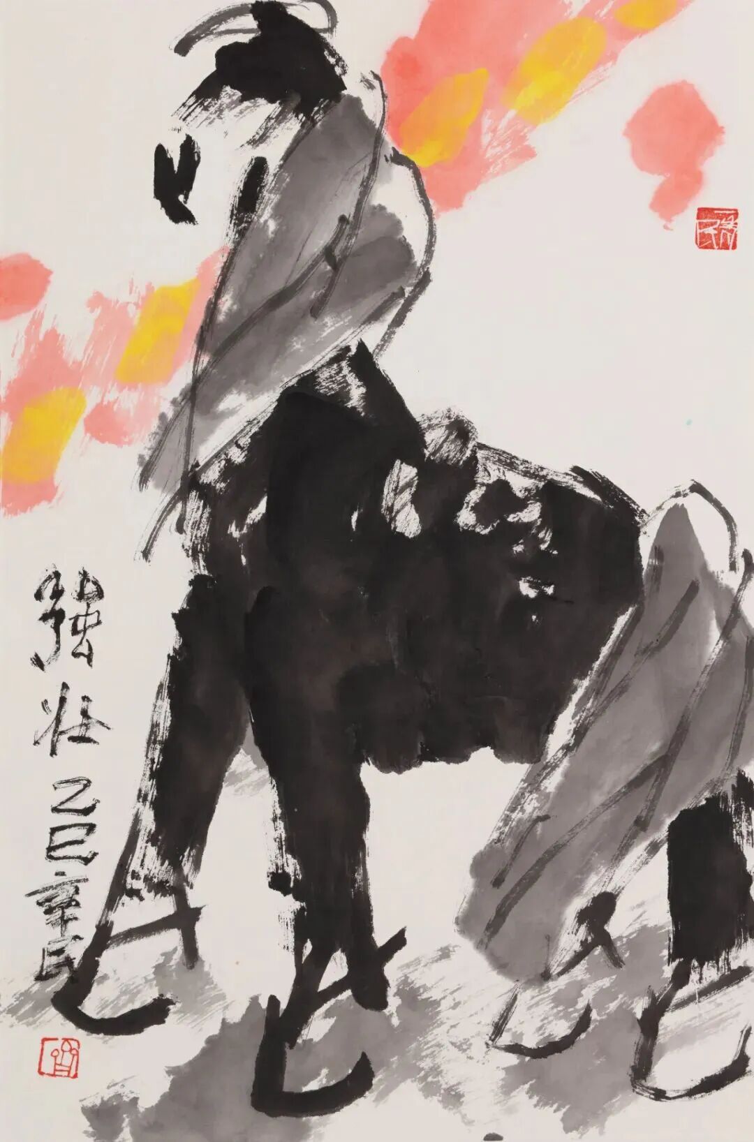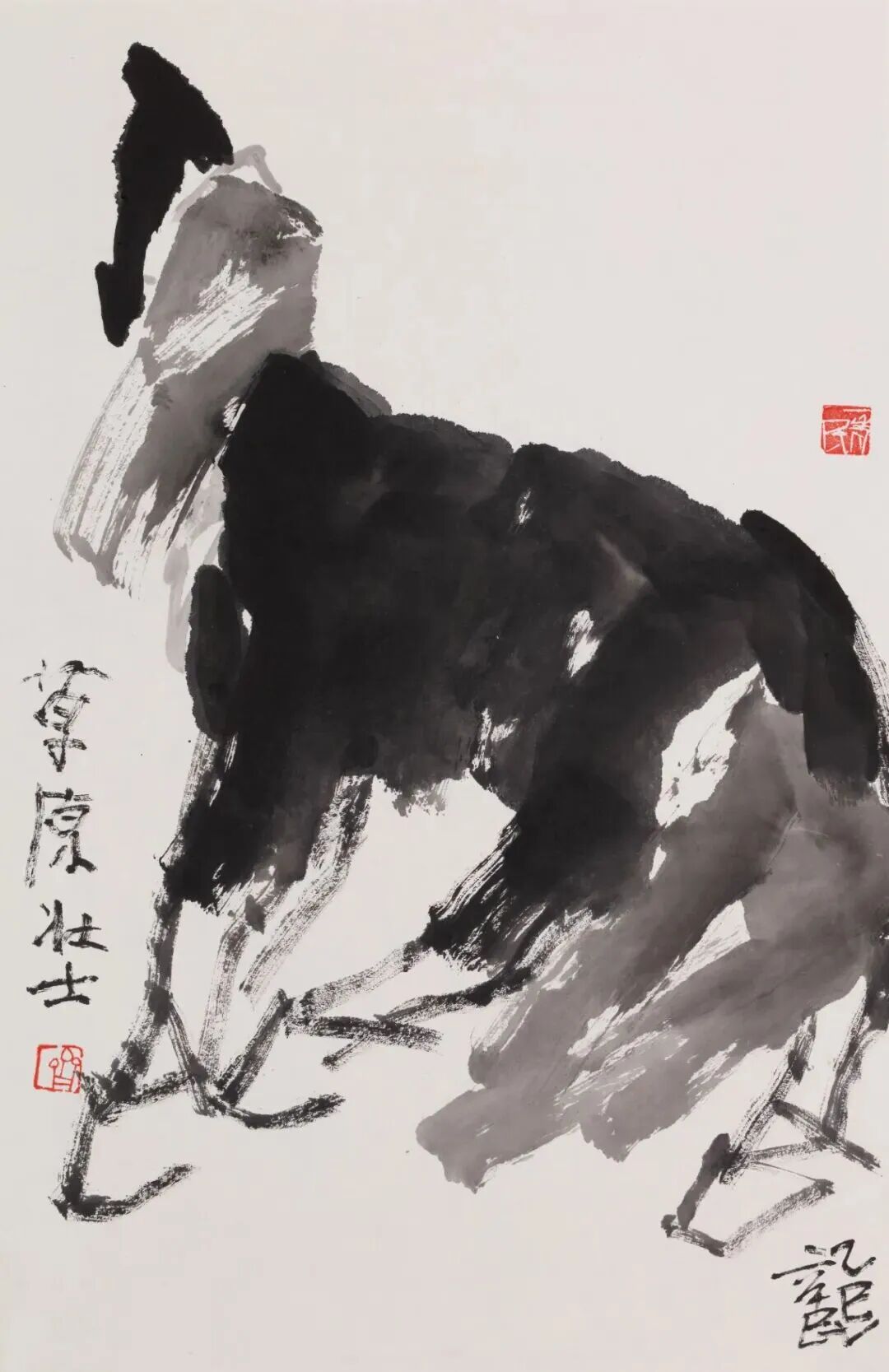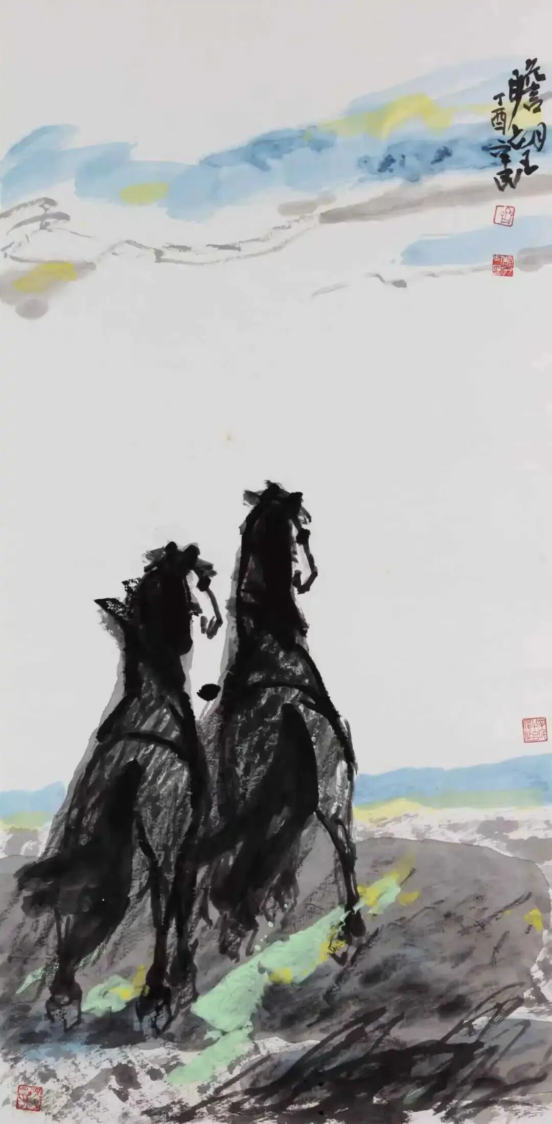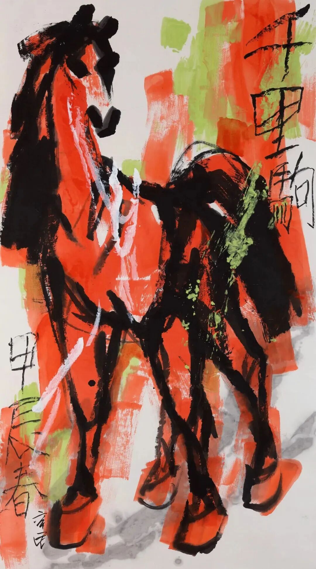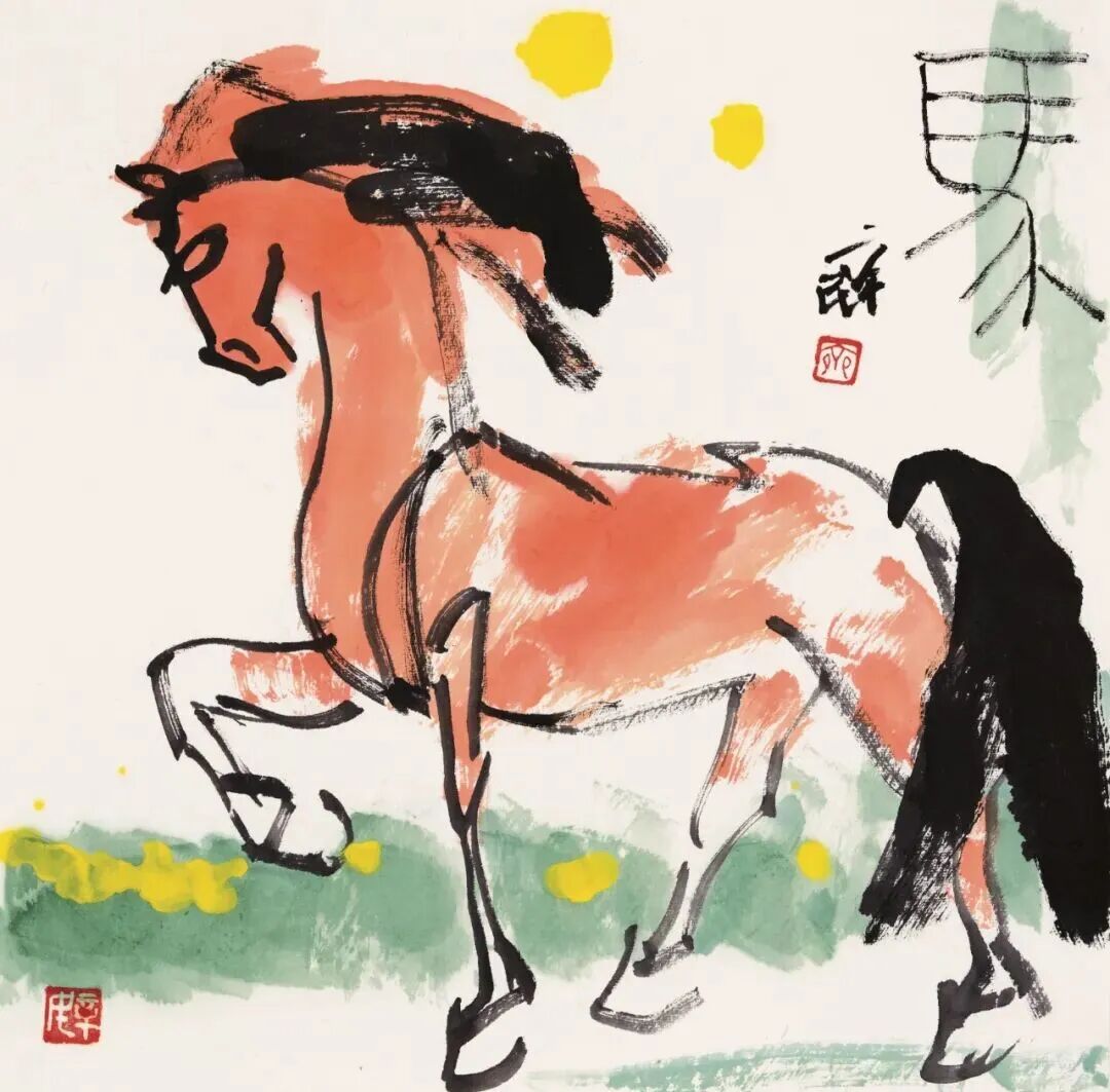 丙午畫馬,自是藝壇風(fēng)尚,也在暗中競(jìng)技。然能革故鼎新、別開生面、自出機(jī)杼者鮮見,多為應(yīng)景作畫,湊個(gè)熱鬧,博些關(guān)注。蓋因畫馬古有韓干、李公麟諸大家之傳摹工繪、形神兼?zhèn)?,近有徐悲鴻一改前人畫馬之法——融合西方解剖學(xué)與東方筆墨,以潑墨寫意表現(xiàn)馬的雄健與中華民族之精神,成就了現(xiàn)代中國畫之典范。時(shí)至當(dāng)代,畫馬者雖眾然出新者寡,能代表當(dāng)今時(shí)代之精神和審美之高度者更是千萬中難覓一二。
