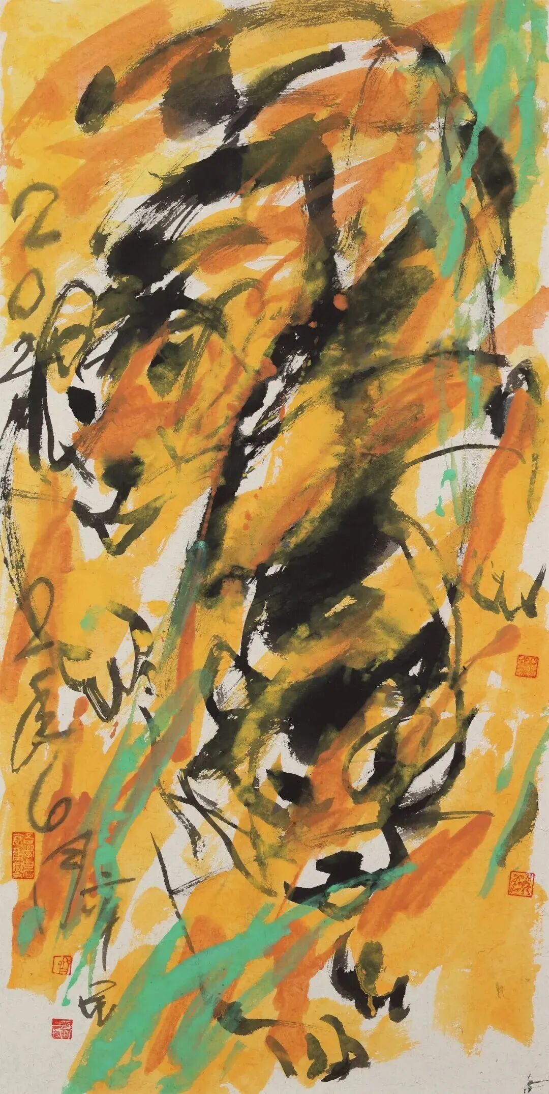 由中國美術(shù)史中畫馬一事的發(fā)展脈絡(luò)和演變軌跡細(xì)觀之齊辛民于丙午年前后創(chuàng)作之“馬”,其最震撼人心的是他運(yùn)用大寫意的筆墨,以更為抽象的點(diǎn)、線、面——多用粗線、大塊面,胸懷破而后立的勇氣,“寫”出了馬的立體形象及其身處的深遠(yuǎn)意境,這一成功嘗試不僅開拓創(chuàng)新了中外畫“馬”的視覺圖像和藝術(shù)語言,也為大寫意在新時(shí)代的發(fā)展樹立了典范,且有望突破當(dāng)代畫馬“有高原而少高峰”的時(shí)代困境。