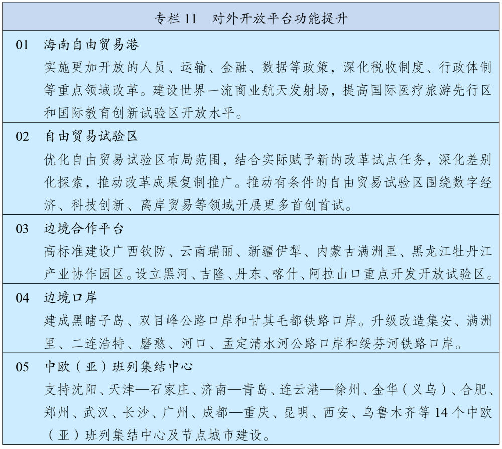 打造形態(tài)多樣的開放高地,加快形成陸海內(nèi)外聯(lián)動、東西雙向互濟的全面開放格局。高標準建設(shè)海南自由貿(mào)易港,高水平實施全島封關(guān)運作,持續(xù)提升貿(mào)易投資和要素流動等重點領(lǐng)域開放水平,逐步構(gòu)建與高水平自由貿(mào)易港相適應(yīng)的政策制度體系。實施自由貿(mào)易試驗區(qū)提升戰(zhàn)略,開展更大力度制度型開放試驗,提升創(chuàng)新引領(lǐng)發(fā)展能級。統(tǒng)籌布局建設(shè)科技創(chuàng)新、服務(wù)貿(mào)易、產(chǎn)業(yè)發(fā)展等重大開放合作平臺,支持功能相近、區(qū)位相鄰的平臺優(yōu)化整合,推動國家級新區(qū)、開發(fā)區(qū)管理制度和運營模式創(chuàng)新,促進綜合保稅區(qū)轉(zhuǎn)型升級,推進沿邊重點開發(fā)開放試驗區(qū)、產(chǎn)業(yè)協(xié)作園區(qū)、沿邊臨港產(chǎn)業(yè)園區(qū)和邊(跨)境經(jīng)濟合作區(qū)等建設(shè)。