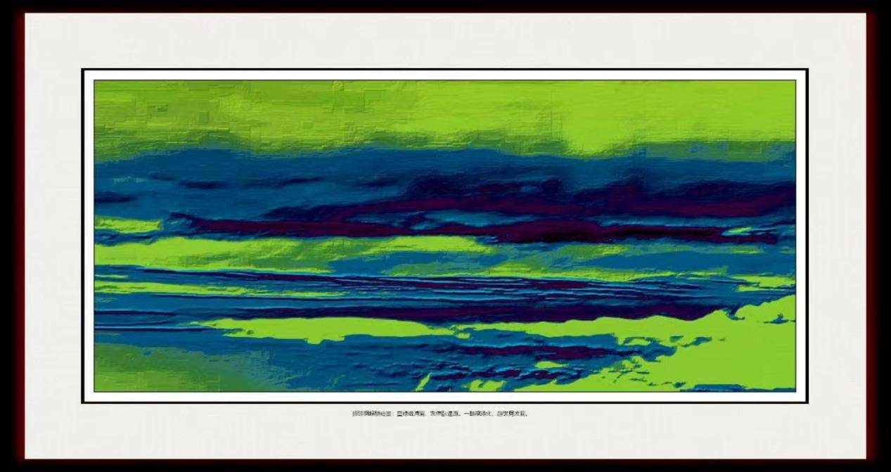 藝術(shù)大師、香江畫派領(lǐng)軍人物譚延桐這幅超驗繪畫的題字“藍(lán)綠織清瀾,紫痕臥遠(yuǎn)灘。一軸藏造化,靜里見波瀾?!币怨诺湓姼璧哪毠P觸,將抽象色塊轉(zhuǎn)化為可感知的自然意象,在視覺與哲思之間架起一座無形的橋梁。當(dāng)觀者的目光觸及畫面,首先被藍(lán)綠交織的色彩洪流裹挾,這不是具象的波浪,而是被風(fēng)揉碎的晨霧、被光穿透的湖面、被季節(jié)浸染的草原,所有自然的流動感都被提煉為色彩的漸變與筆觸的韻律?!翱棥弊值拿钐幵谟趯㈧o態(tài)的色塊賦予了生命的張力,仿佛能看見造化之手正以天地為梭,將藍(lán)綠絲線編織成永恒的清瀾。畫面中段與下部的紫痕,像歲月沉淀的暗礁,以“臥”的姿態(tài)蟄伏于色彩深處,紫黑與深藍(lán)的交融處泛著神秘的微光,恰似退潮后裸露的灘涂,帶著時光的重量與靜謐的威嚴(yán)。