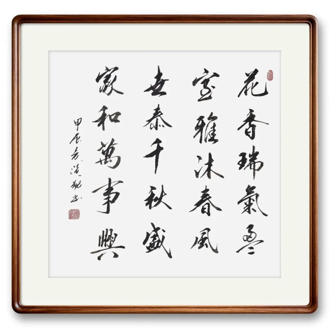 先生書法,根在傳統(tǒng),魂在氣象。自幼臨池不輟,上追漢魏碑刻之樸厚,中取唐楷法度之嚴謹,下融行草靈動之神韻,數十年如一日堅守筆墨正道。其用筆中鋒挺立,側鋒相生,提按頓挫間盡顯功力,線條圓勁厚重如金石篆刻,舒展流暢似行云流水,無浮躁之氣,無媚俗之態(tài),真正做到筆筆有來歷,字字見精神。觀其作品,大字雄強開張,氣勢磅礴,有壁立千仞之概;小字溫潤典雅,清秀俊逸,含清風明月之姿,剛柔相濟,收放自如,盡顯傳統(tǒng)書法的中和之美。