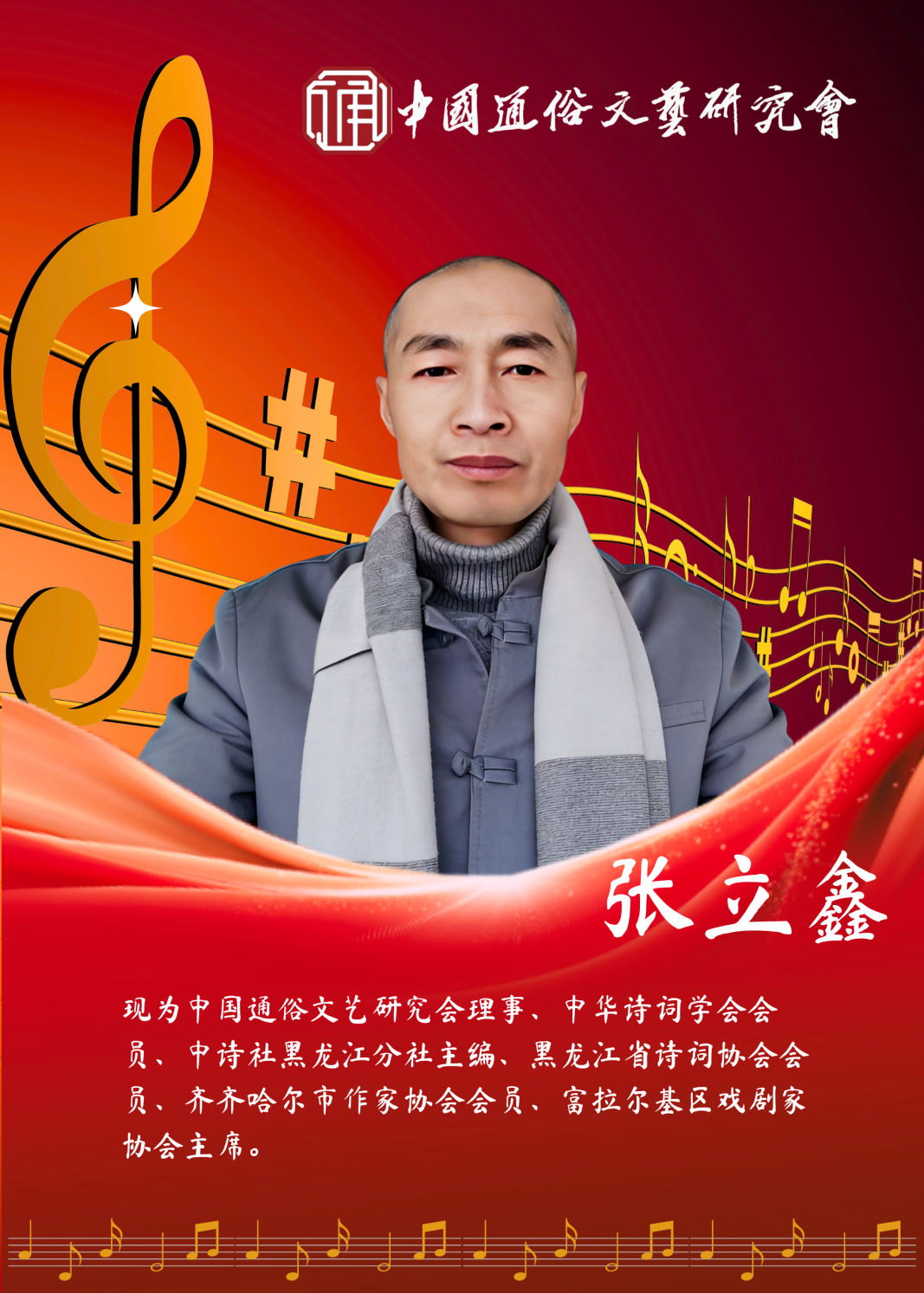 現(xiàn)為:中國(guó)通俗文藝研究會(huì)理事、中華詩(shī)詞學(xué)會(huì)會(huì)員、中詩(shī)社黑龍江分社主編、黑龍江省詩(shī)詞協(xié)會(huì)會(huì)員、齊齊哈爾市作家協(xié)會(huì)會(huì)員、富拉爾基區(qū)戲劇家協(xié)會(huì)主席