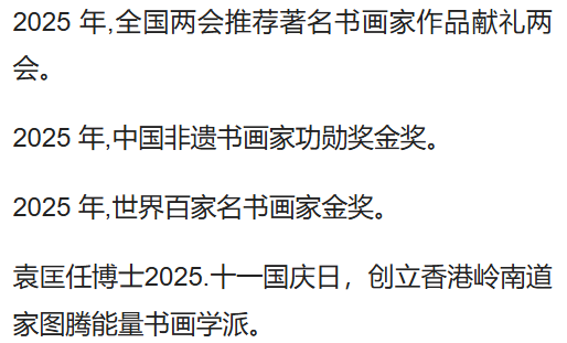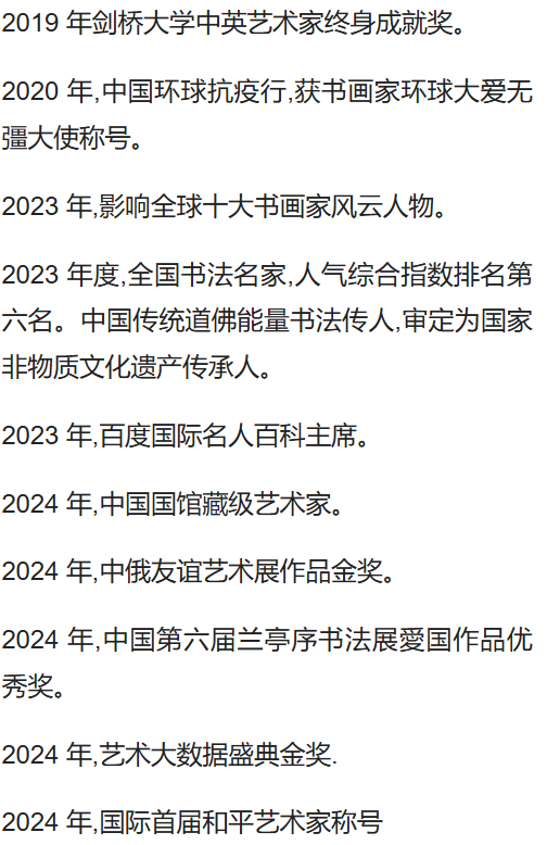 其書畫作品兼具文化底蘊(yùn)與藝術(shù)美感,廣受業(yè)界認(rèn)可,擔(dān)任香港愛港愛國(guó)書法家協(xié)會(huì)主席、中國(guó)(香港) 書法家協(xié)會(huì)名譽(yù)主席、廣東省政協(xié)書畫會(huì)常務(wù)副主席等職,入選2025年收藏風(fēng)云榜十大人物。憑借卓越的藝術(shù)成就,先后斬獲中英、法國(guó)、亞洲及世界藝術(shù)文化終身成就獎(jiǎng)、中國(guó)書畫家終身成就獎(jiǎng)等重磅榮譽(yù),是香港文化藝術(shù)界罕見的全才型藝術(shù)家、書畫家。