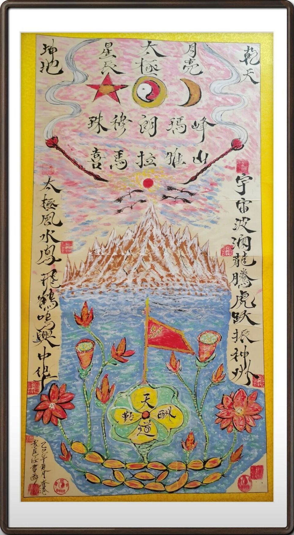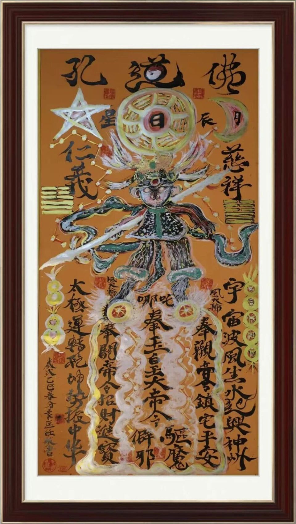 1988年,袁匡任博士皈依道教香港青松觀,道號(hào)羅峰,師承侯寶桓觀長(zhǎng),入道三十八載,潛心修行、弘揚(yáng)道學(xué)。他深耕道家文化研究,研習(xí)葛洪等道家先賢思想,融合道佛、國(guó)學(xué)與孔學(xué)周易,創(chuàng)立孔道佛圖騰風(fēng)水能量書畫學(xué)派,將道家哲思與藝術(shù)創(chuàng)作、堪輿實(shí)踐深度結(jié)合。