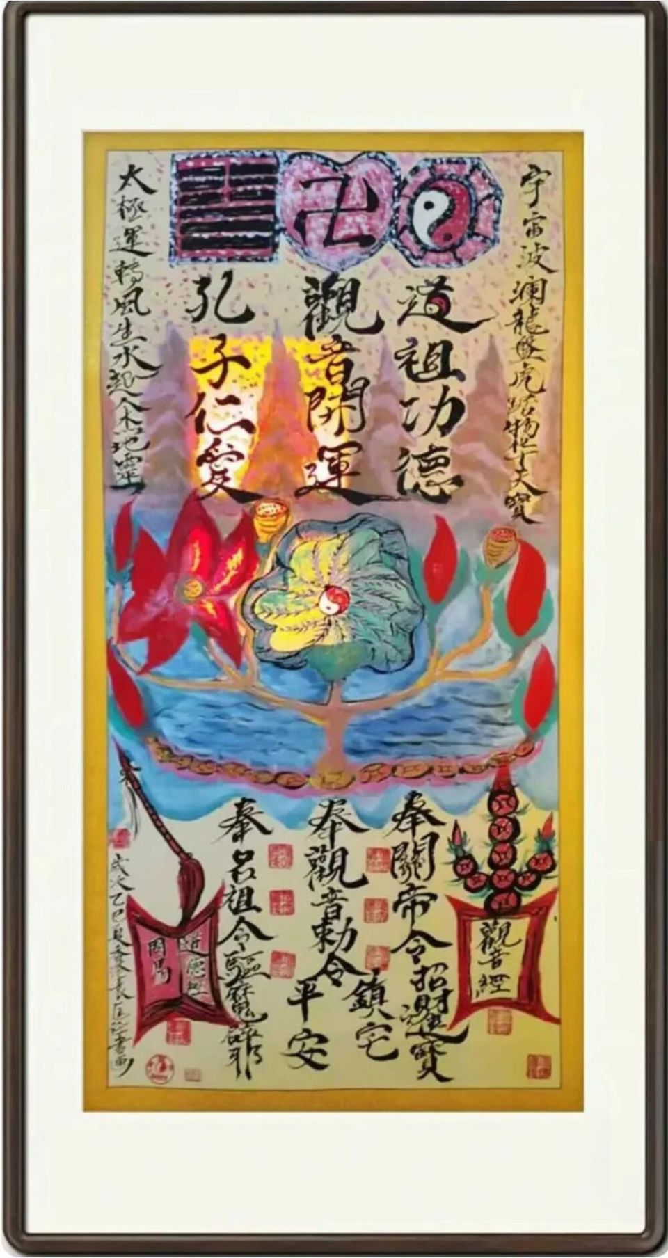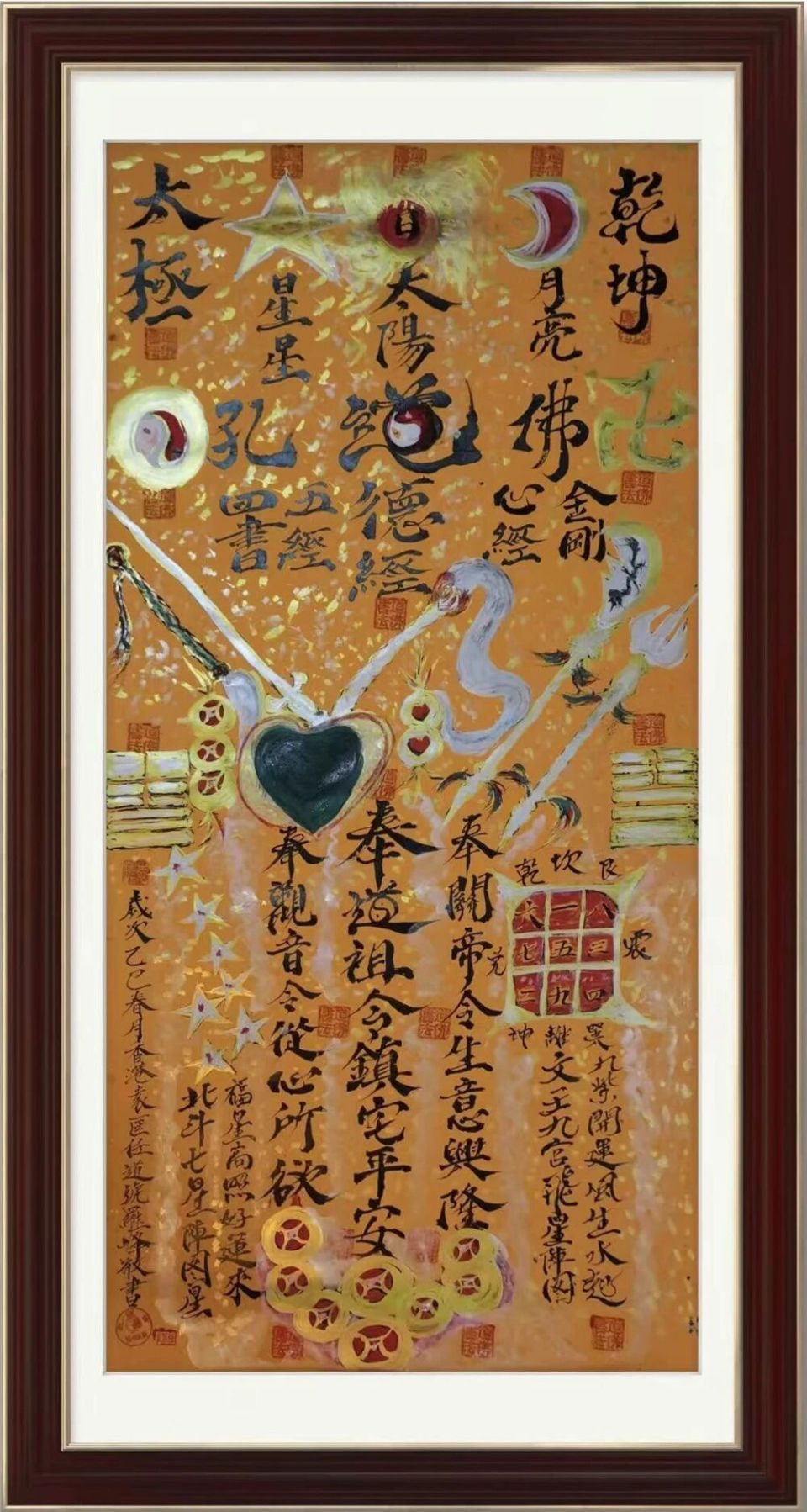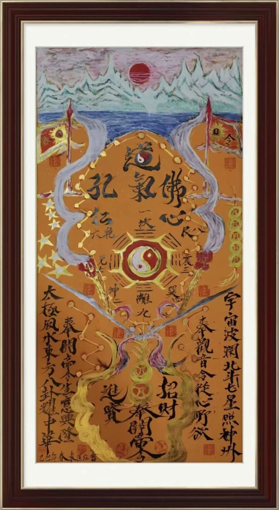 主要元素:日月星辰,冰峰,山河,海洋,旭日,紫氣,神鷹,孔道佛,仁愛,慈祥,功德,長(zhǎng)壽,養(yǎng)生,養(yǎng)心,關(guān)刀,拂塵,葫蘆,金錢,金剛經(jīng),道德經(jīng),春秋經(jīng),周易,四書,五經(jīng),心經(jīng),關(guān)帝,觀音,呂祖,道祖,佛祖,太極,乾坤,宇宙,北斗,八卦。蓮花,蓮藕,蓮子,道筆,龍鳳,鎮(zhèn)宅,平安,驅(qū)魔僻邪,招財(cái),進(jìn)寶,生意興隆,身體健康,財(cái)源滾滾,有求必應(yīng),天后,黃大仙,天道酬勤,海納百川,神州,中華。卍,天地,老子,孔子,太上老君,道法自然,佛心,道心。