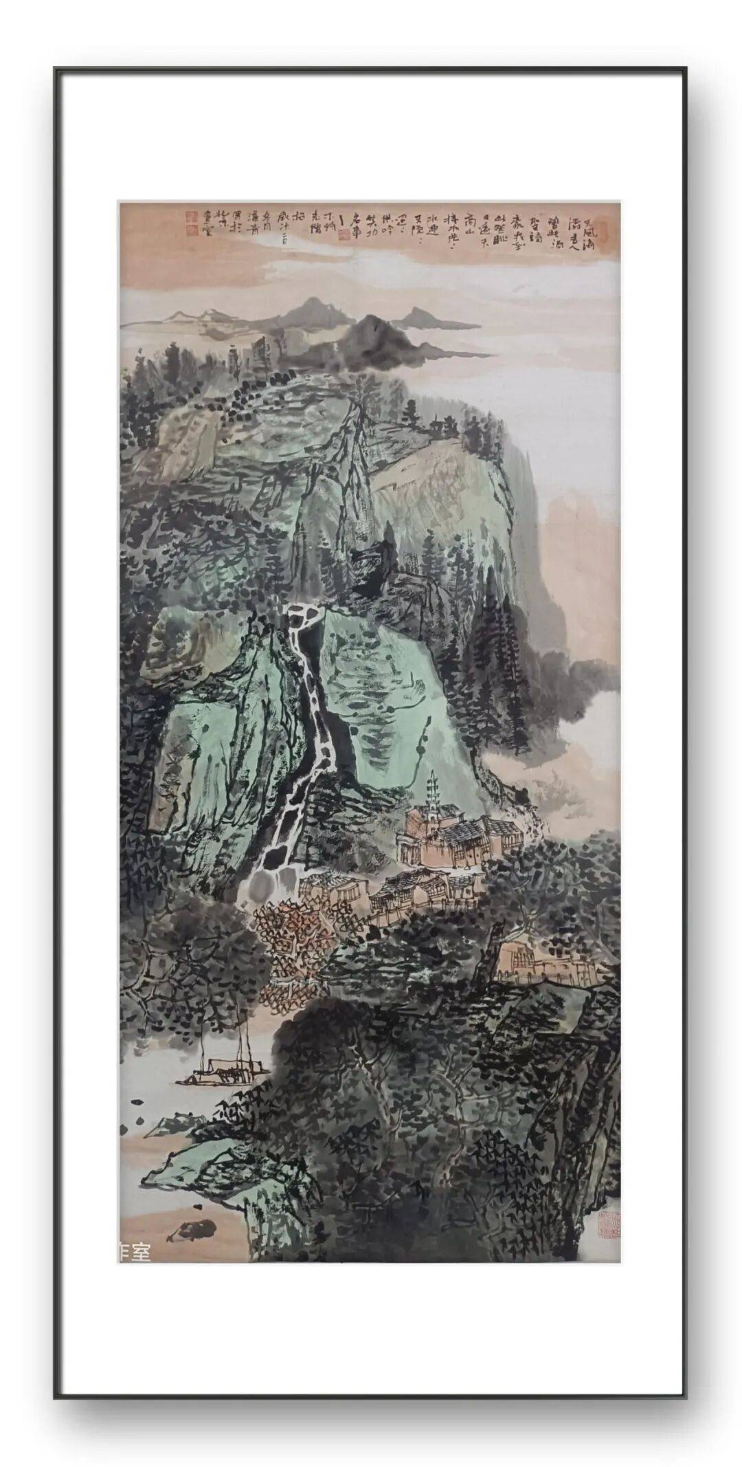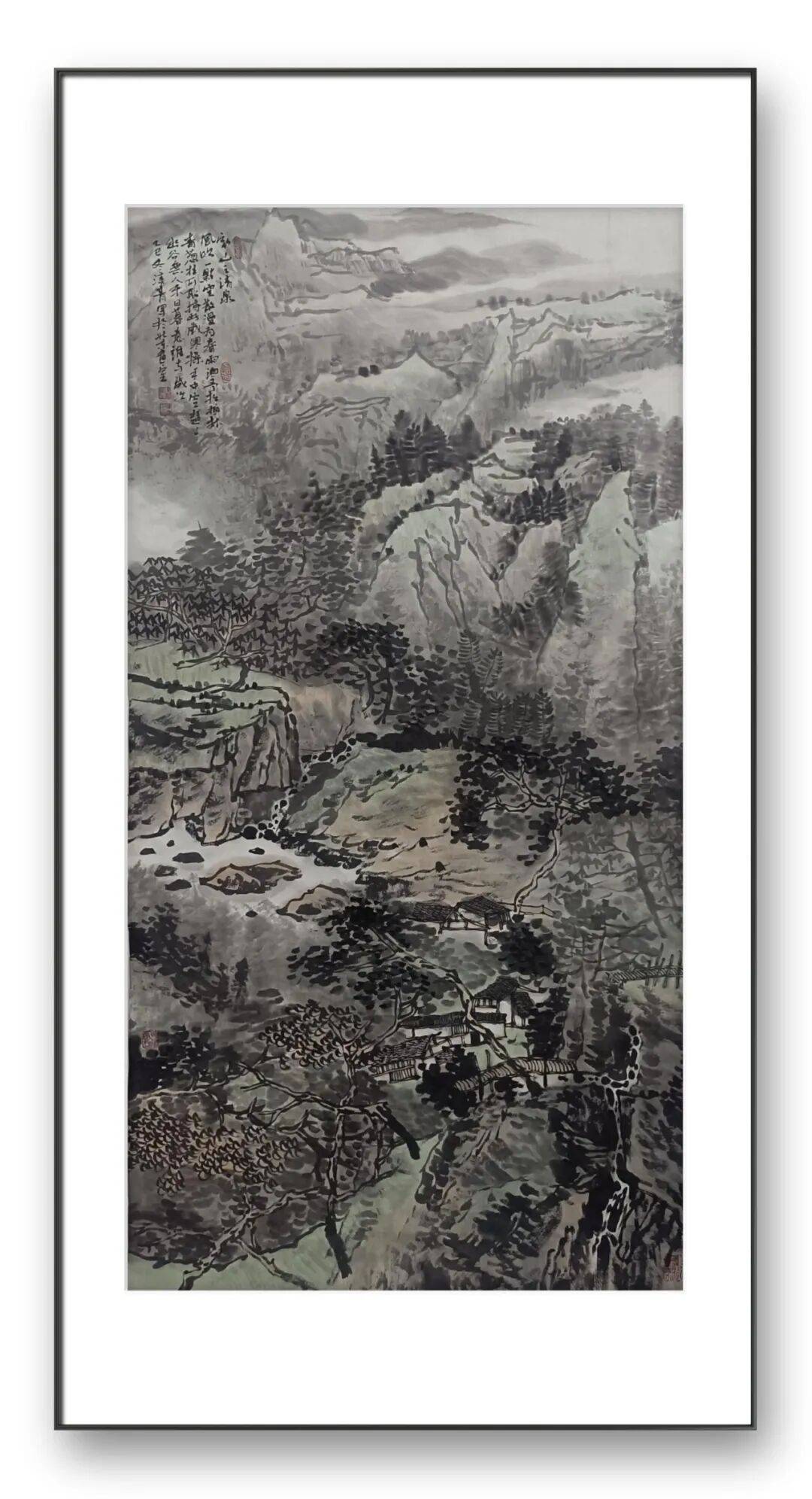 其山水作品的意境,兼具雄渾壯闊與空靈雋永兩種特質(zhì)。部分作品以宏大的構(gòu)圖展現(xiàn)山河的磅礴氣勢,層巒疊嶂的群山、奔騰不息的江河、云霧繚繞的幽谷,營造出“一覽眾山小”的壯闊氣象,筆墨間盡顯山河的雄奇險峻,傳遞出天地自然的磅礴力量,讓觀者仿佛置身于山川之間,感受自然的震撼與壯美;另有部分作品則以細膩的筆觸描繪山水的清幽雅致,小橋流水、竹林茅舍、溪澗松石,勾勒出田園山水的靜謐安然,意境空靈悠遠,給人以“鳶飛戾天者,望峰息心;經(jīng)綸世務(wù)者,窺谷忘反”的超脫之感,盡顯東方藝術(shù)的閑適與詩意。