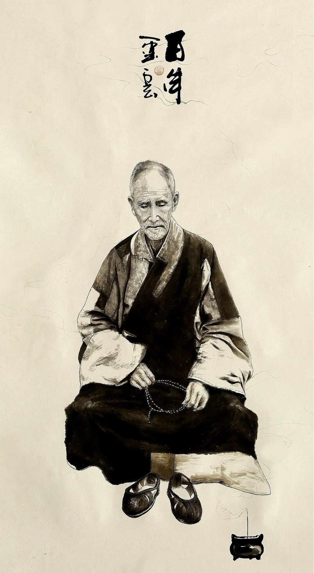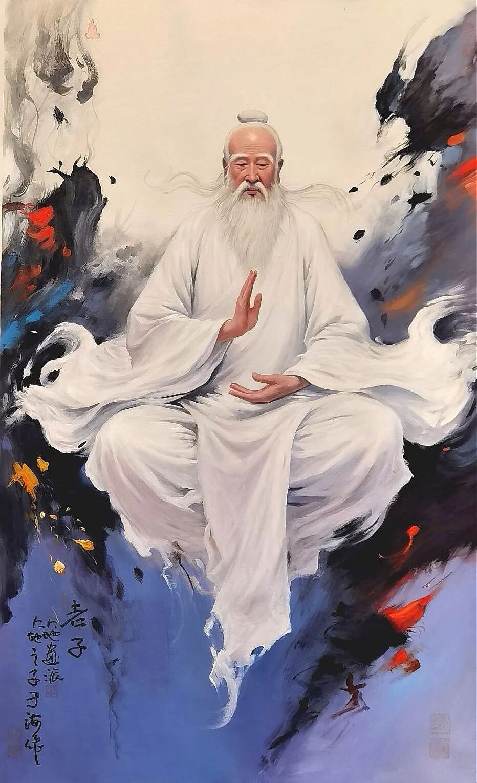- 問道系列:以油畫厚重和靈動(dòng)水墨寫實(shí)筆墨相結(jié)合,直抵道心,將其十年之功讀道德經(jīng)數(shù)百遍后所感悟和鏈接出的心中華夏道統(tǒng)/天道圣人——老子圣像表現(xiàn)得淋漓盡致氣運(yùn)非凡,把《道德經(jīng)》的大智慧化為當(dāng)代視覺深度哲思。