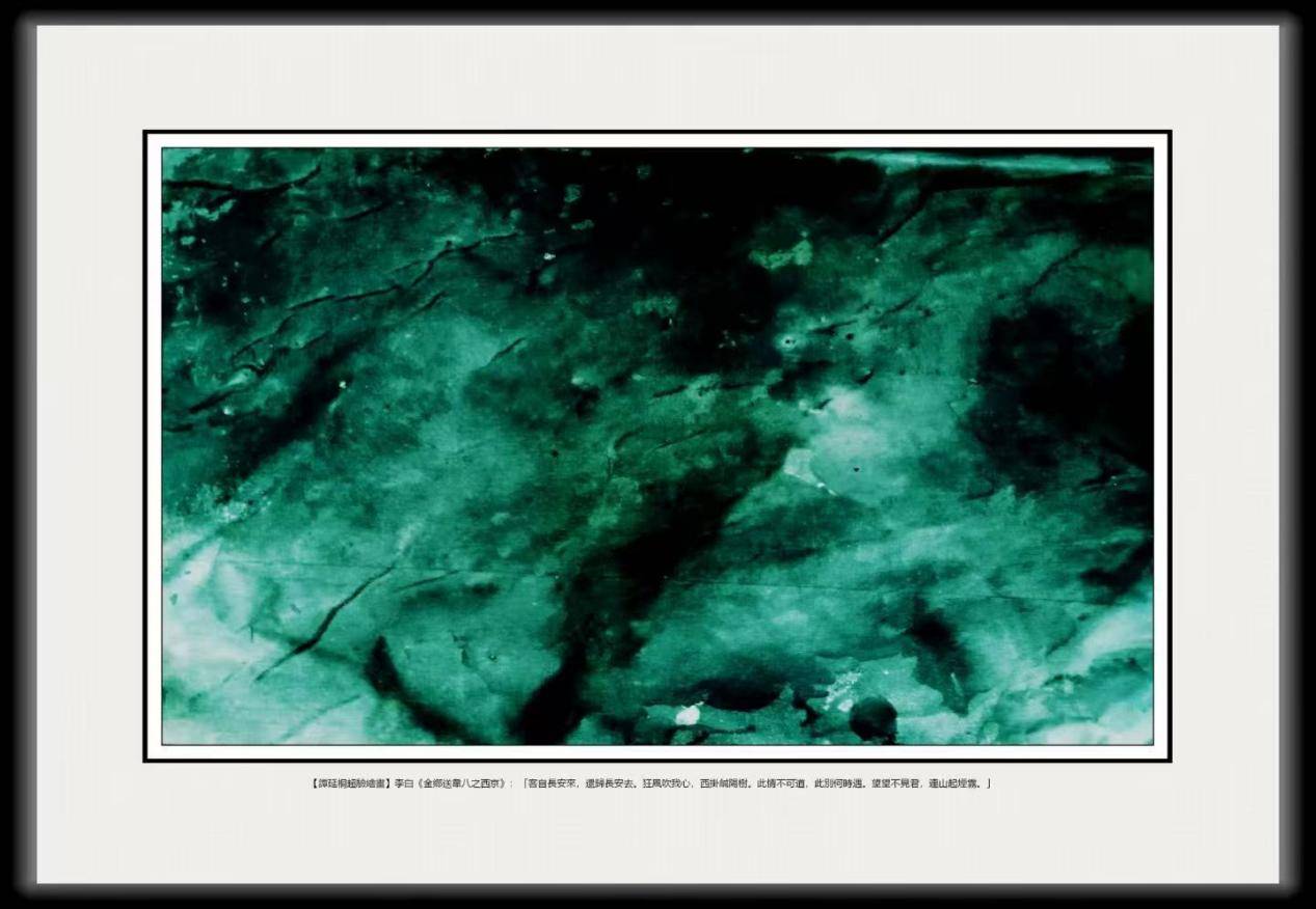 畫面的精神內(nèi)核是詩與畫的超驗共鳴。李白說“此情不可道”,譚延桐便用抽象的墨色實現(xiàn)了不可道的道,沒有具體的離別場景,但每一筆墨色都在言說,深墨說痛,淺綠說柔,白色說念,這種不說之說比具體的形象更有力量,像煙霧比山更能表現(xiàn)迷茫,狂風(fēng)比樹更能表現(xiàn)牽掛。離別是瞬間的,但思念是永恒的,譚延桐用墨色的層次折疊了瞬間與永恒。深墨的瞬間(離別的痛)里藏著淺綠的永恒(牽掛的延續(xù)),白色的瞬間(未說出口的話)里藏著黑的永恒(未知的未來),像李白詩中的“此別何時遇”,不是何時再遇,而是永遠在遇,因為思念從未停止。