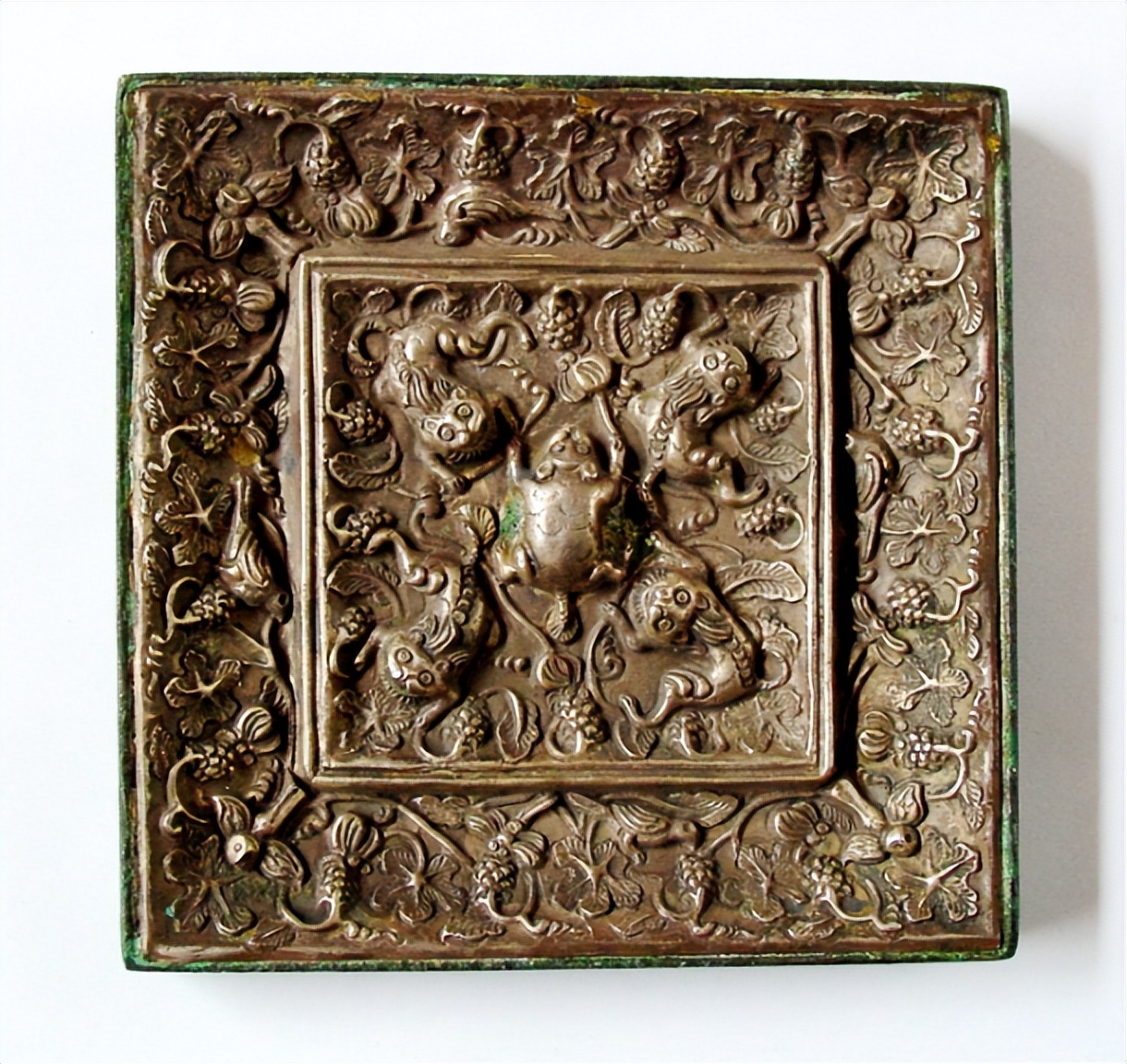 1.形制珍?。和黄铺歧R主流圓形,呈規(guī)整方形;伏獸鈕居中,方形雙線(xiàn)銀框分內(nèi)外兩區(qū),窄銅緣收尾。存世量遠(yuǎn)少于圓形鏡,屬唐鏡中的小眾珍品。