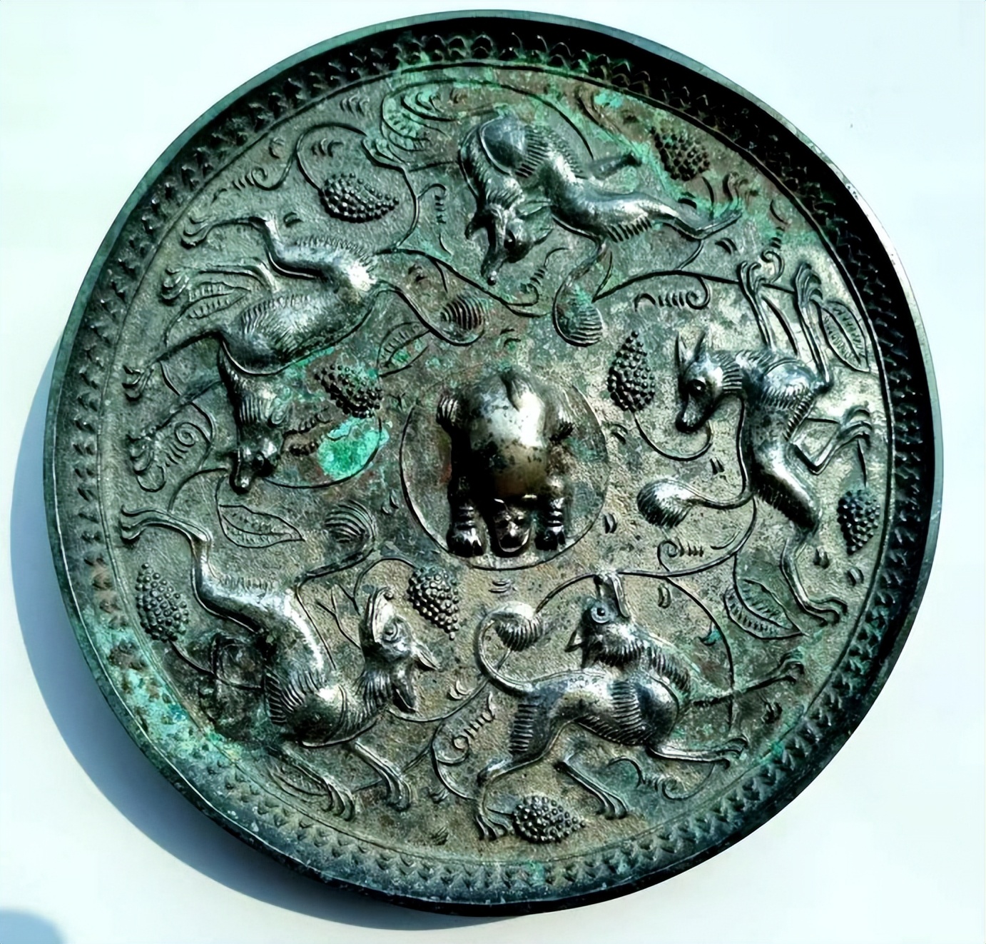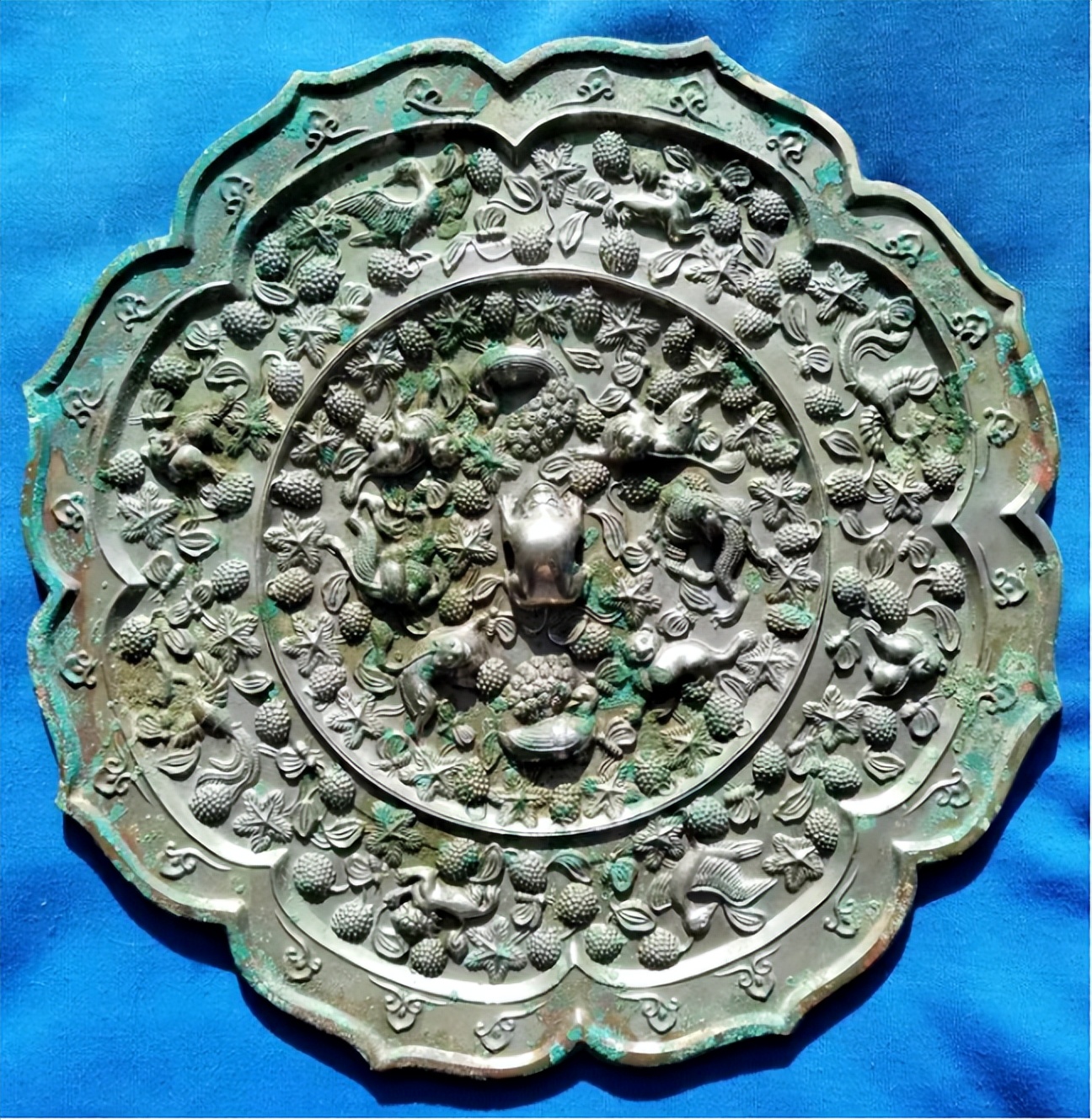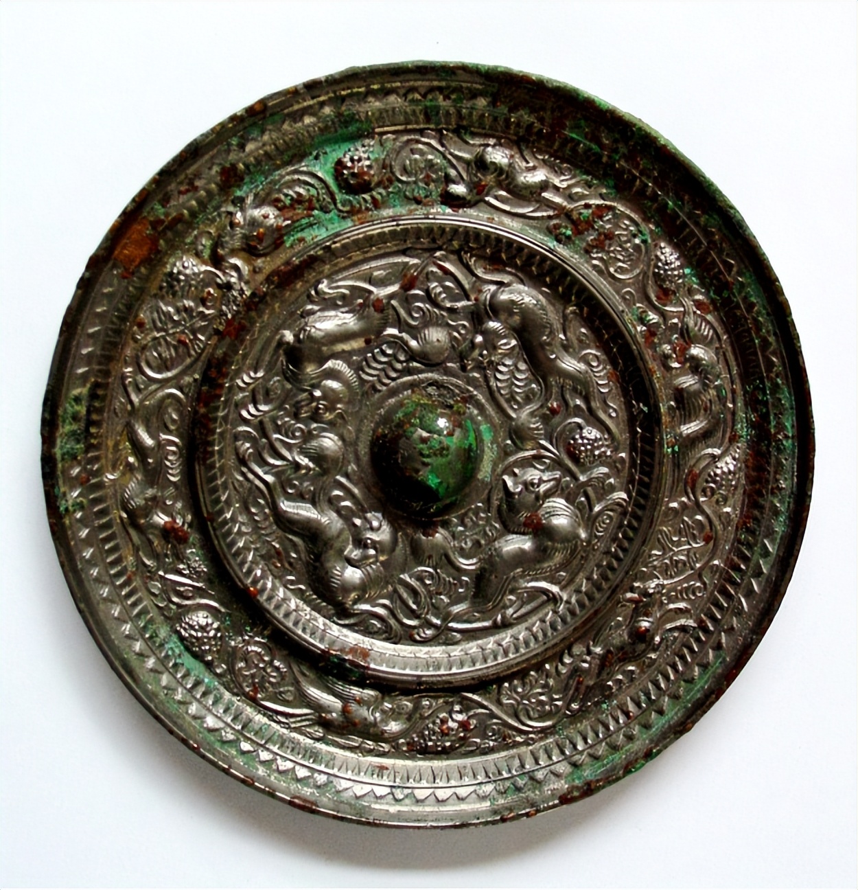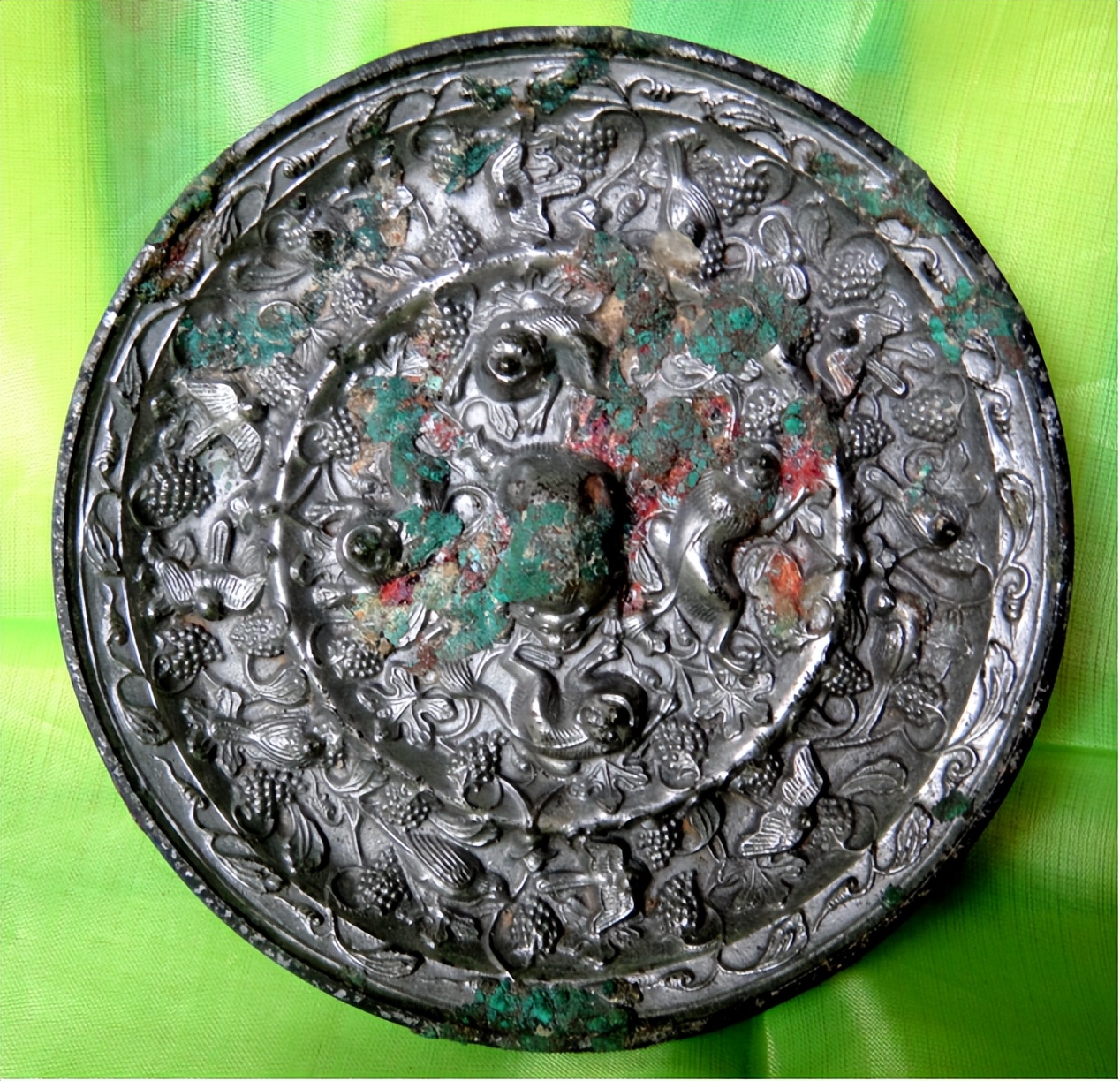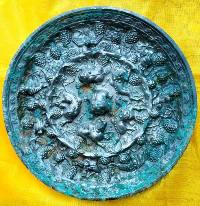 2.銀背絕技:并非純銀鏡,而是銅鏡胎體上整體鑲嵌銀殼,再于銀背進(jìn)行高浮雕。銀質(zhì)細(xì)膩,浮雕線(xiàn)條流暢,立體感極強(qiáng);葡萄的垂墜、海獸的鬃毛、禽鳥(niǎo)的羽翼皆刻畫(huà)入微,經(jīng)歲月沉淀后銀殼泛出溫潤(rùn)包漿。