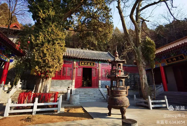 第二層左側是藥師殿,右側是三佛殿。正中是大雄寶殿。值得一提的是,這一層院里有兩株千年古柏。其中一株至今高大挺拔,柏葉蒼翠。它可以證明寺廟的悠久歷史。