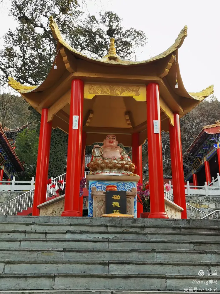 這座義凈寺分三層。第一層正中亭子里供奉阿彌陀佛,背后是韋陀菩薩。