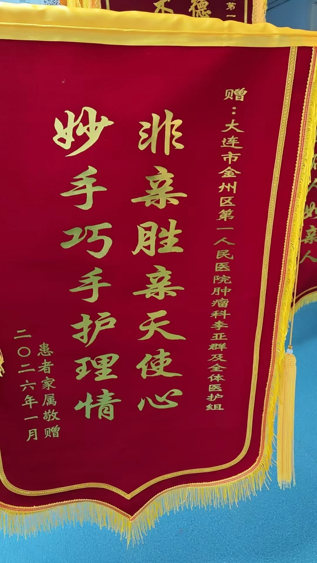 近日,大連市金州區(qū)第一人民醫(yī)院腫瘤科收到一面承載著家屬無盡感激的錦旗,錦旗上“非親勝親天使心,妙手巧手護(hù)理情”的字樣,訴說著一段充滿愛與責(zé)任的醫(yī)患故事,也彰顯了金州區(qū)第一人民醫(yī)院腫瘤科盡責(zé)治療與人文關(guān)懷的醫(yī)者初心。