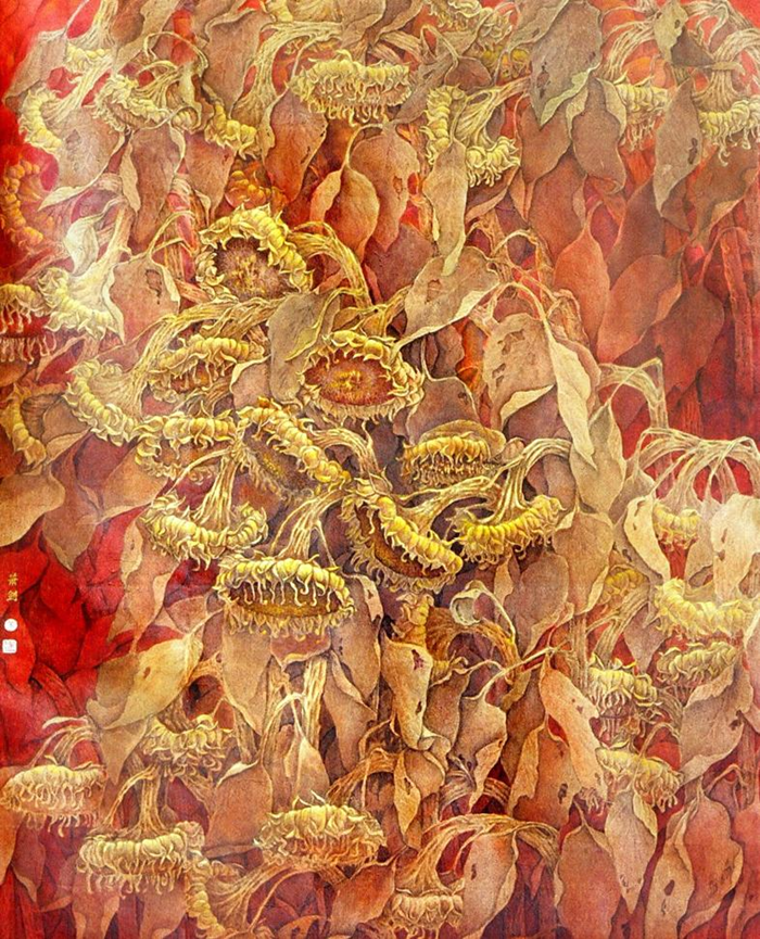 蕭劍的向日葵系列創(chuàng)作涵蓋水墨寫意與沒骨工筆,誕生了《金秋》《季風(fēng)》《金杯承露》《向陽而生》《欣欣向榮》等諸多經(jīng)典代表作品,構(gòu)建起完整的生命敘事體系,完成了從自然意象到精神意象的層層升華。該系列作品中,《金秋》以成熟葵園繪就豐收之美,斬獲湖南省首屆花鳥畫大展金獎,成為其葵花創(chuàng)作的標(biāo)志性起點;《季風(fēng)》以風(fēng)中葵株喻人生起伏,彰顯生命韌性;《金杯承露》以極致工筆刻畫葵花清雅之姿,入選全國中國畫作品展,奠定其藝術(shù)水準(zhǔn)高度;《向陽而生》直指“追光”精神內(nèi)核,詮釋篤定的人生信念;而繪有56朵葵花的《欣欣向榮》,更將自然生機與家國情懷相融,不僅展現(xiàn)56個民族踔厲奮發(fā)的精神面貌,還曾亮相天安門城樓藝術(shù)廳并被收藏。這些作品串聯(lián)起“生長—盛放—迎風(fēng)—承露—豐盈”的生命閉環(huán),以一花寫盡生命輪回,實現(xiàn)了以物寄情、借物言志、以小景觀大世界的藝術(shù)表達(dá)。