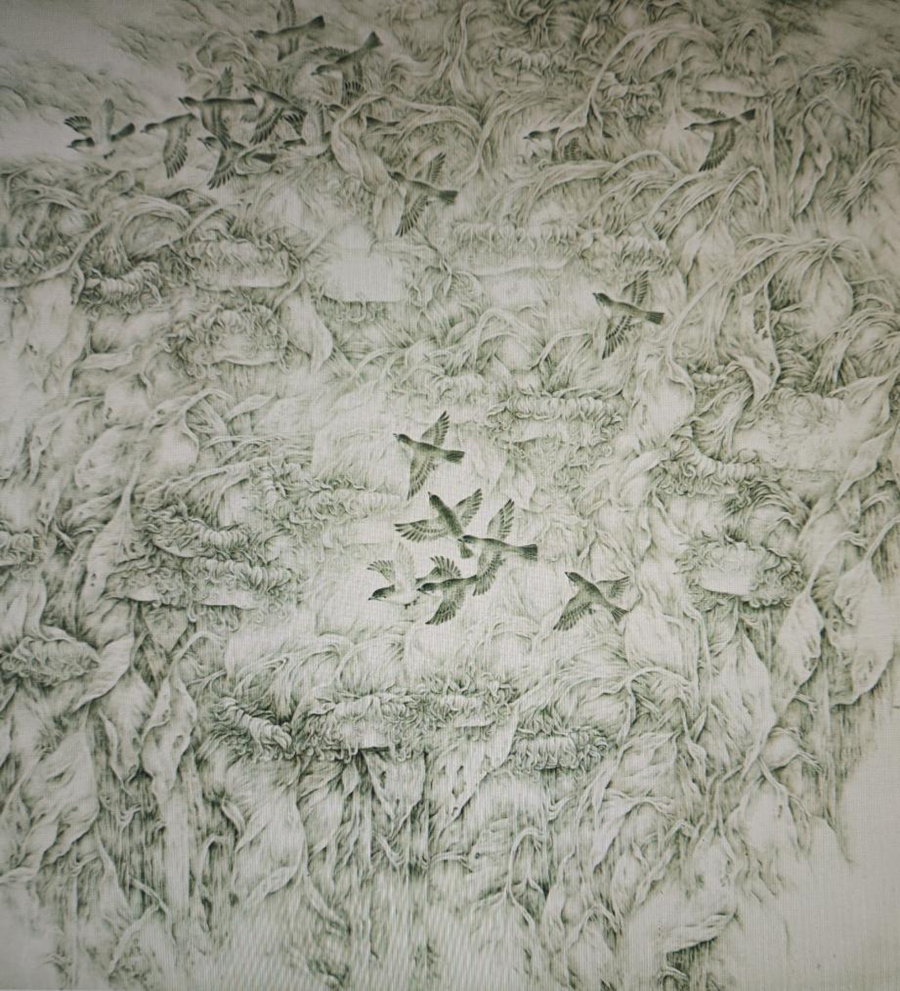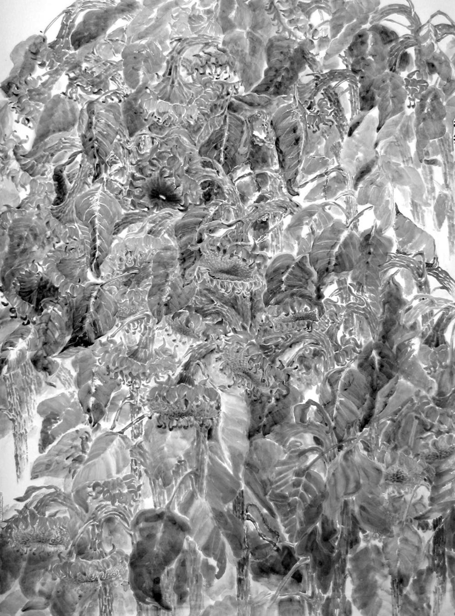 工筆與寫意的圓融共生,是蕭劍向日葵系列最鮮明的藝術(shù)特質(zhì)。在工筆創(chuàng)作中,蕭劍謹(jǐn)嚴(yán)細(xì)膩、立形鑄韻,《金秋》以光影深淺與暖灰色疊染勾勒葵花形態(tài),營造出富有空間感的視覺效果;《金杯承露》更是以剛?cè)嵯酀?jì)的線條、溫潤典雅的設(shè)色打造出中國畫工筆領(lǐng)域首例純灰色調(diào)作品,將精工與氣韻完美結(jié)合,延續(xù)“骨法用筆、隨類賦彩”的傳統(tǒng)。而在寫意創(chuàng)作中,其筆墨灑脫靈動、以心傳情,《向陽而生》《欣欣向榮》植入書法用筆用墨之法,水墨酣暢淋漓;《故鄉(xiāng)云》以寫意筆法繪無形之風(fēng),實現(xiàn)筆斷意連、虛實相生,盡顯中國畫“氣韻生動”的精髓。工筆寫形、寫意傳神,二者互補共生,讓作品既保留傳統(tǒng)筆墨韻味,又契合當(dāng)代審美需求。