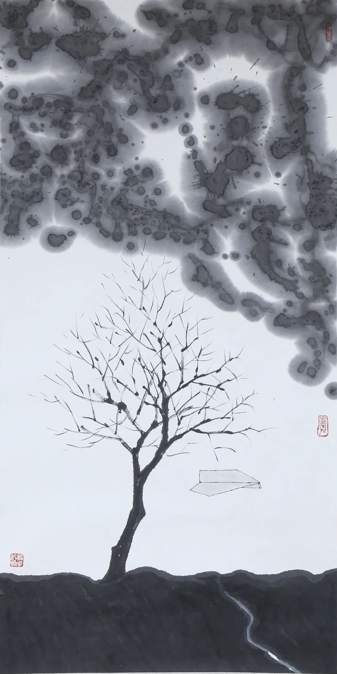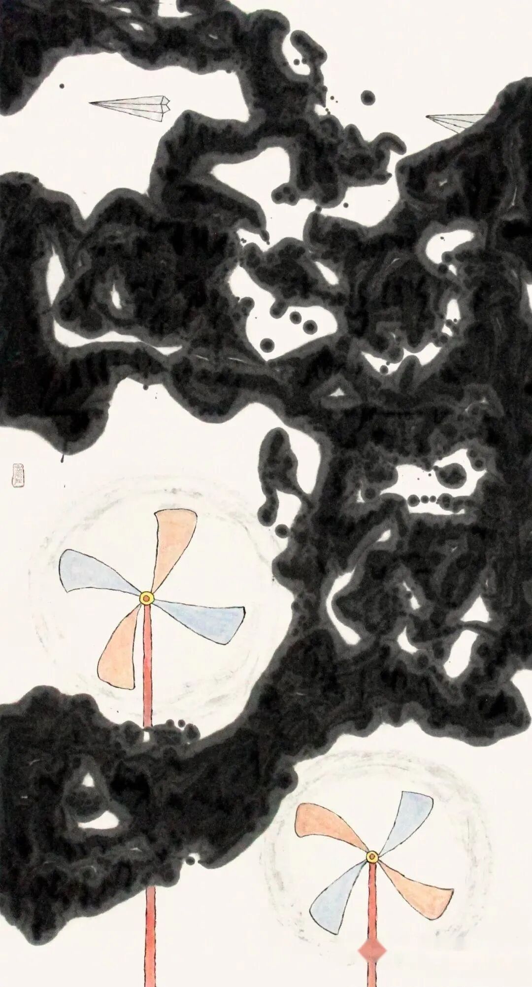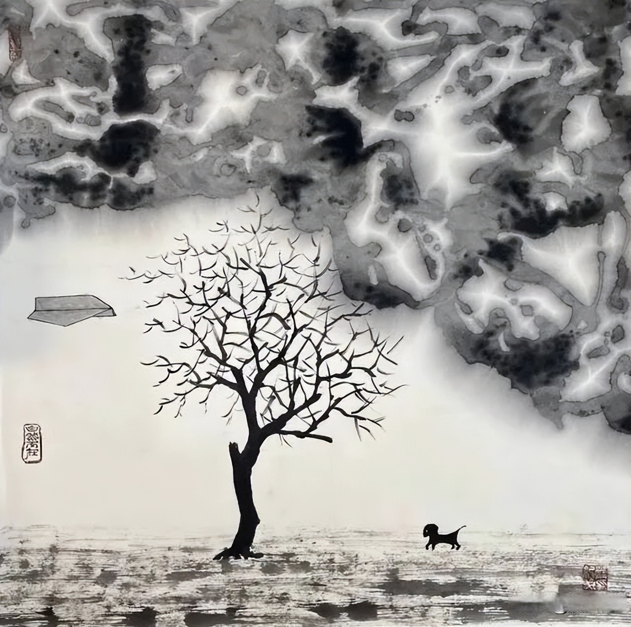 紙飛機是其最具辨識度的核心意象之一。作為童年的純真符號,紙飛機承載著童真、夢想與對自由的向往。在《紙飛機與云》中,潑墨云氣變幻莫測,枯樹虬勁,紙飛機輕盈掠過,傳統(tǒng)水墨與現(xiàn)代符號碰撞,營造出童心與天地共生的禪意氛圍,隱喻靈魂的純粹與對自由的本能追求。在《紙飛機與風(fēng)之吟》里,大面積潑墨抽象紋理似風(fēng)似云,枯樹枝干伸展,紙飛機環(huán)繞飛舞,將無形的“風(fēng)”具象化,傳遞出生命在自由中律動、在前行中綻放的姿態(tài)。