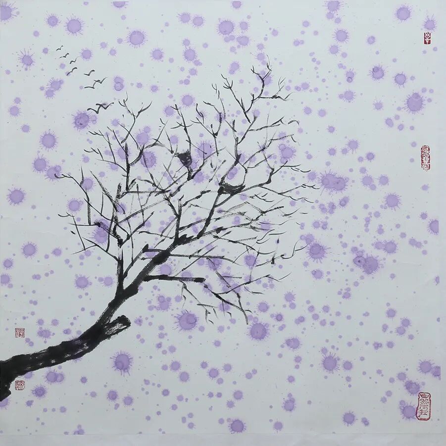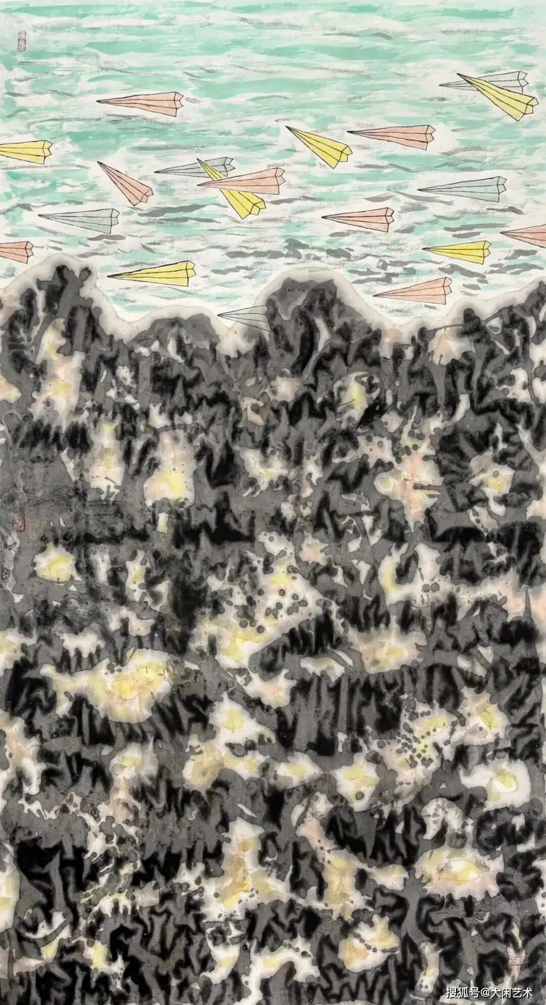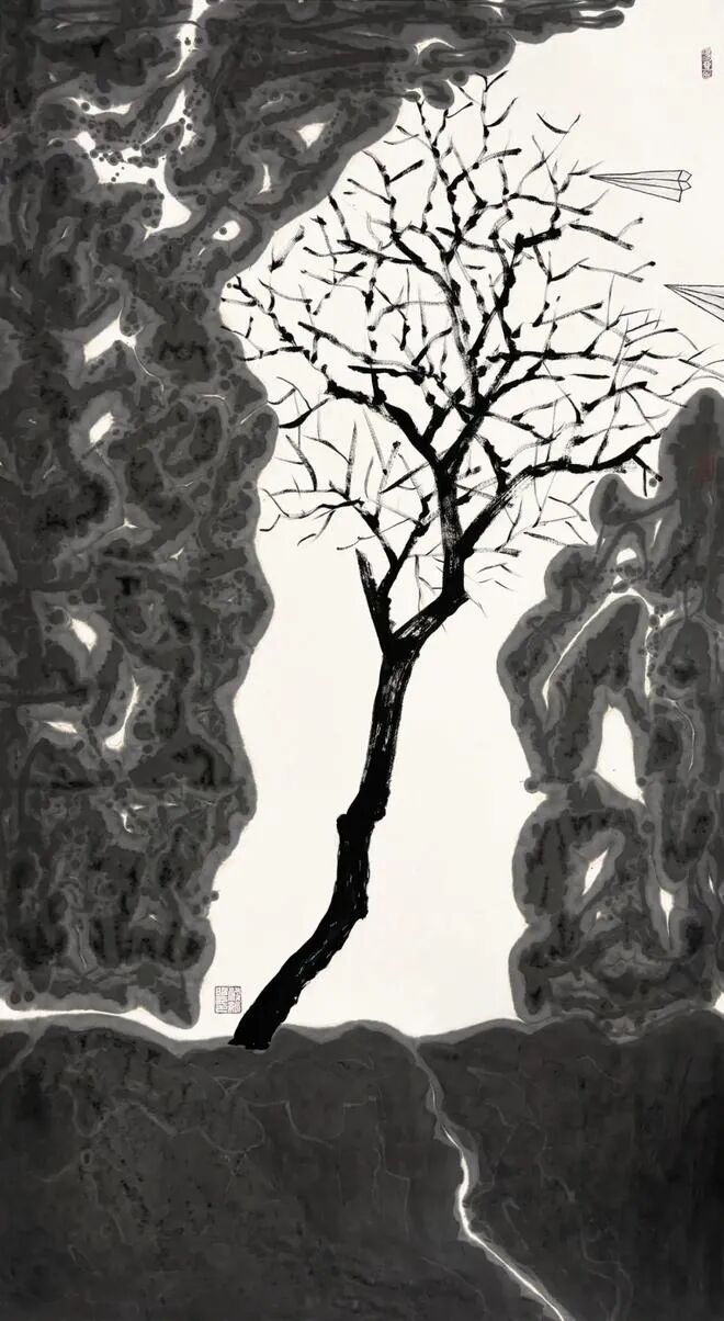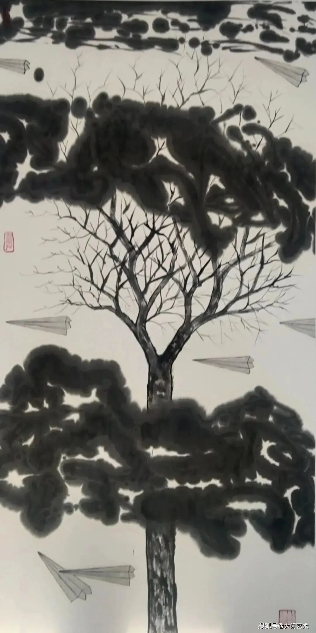 紙飛機是其最具辨識度的核心意象之一。作為童年的純真符號,紙飛機承載著童真、夢想與對自由的向往。在《紙飛機與云》中,潑墨云氣變幻莫測,枯樹虬勁,紙飛機輕盈掠過,傳統(tǒng)水墨與現(xiàn)代符號碰撞,營造出童心與天地共生的禪意氛圍,隱喻靈魂的純粹與對自由的本能追求。在《紙飛機與風(fēng)之吟》里,大面積潑墨抽象紋理似風(fēng)似云,枯樹枝干伸展,紙飛機環(huán)繞飛舞,將無形的“風(fēng)”具象化,傳遞出生命在自由中律動、在前行中綻放的姿態(tài)。