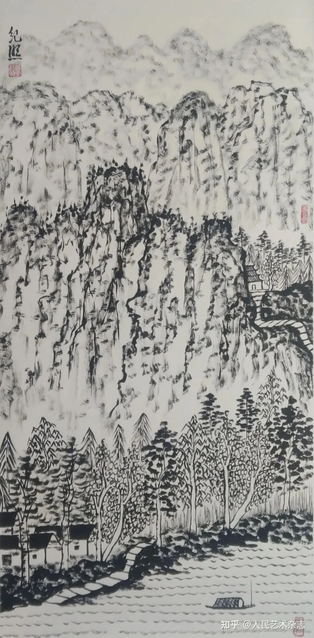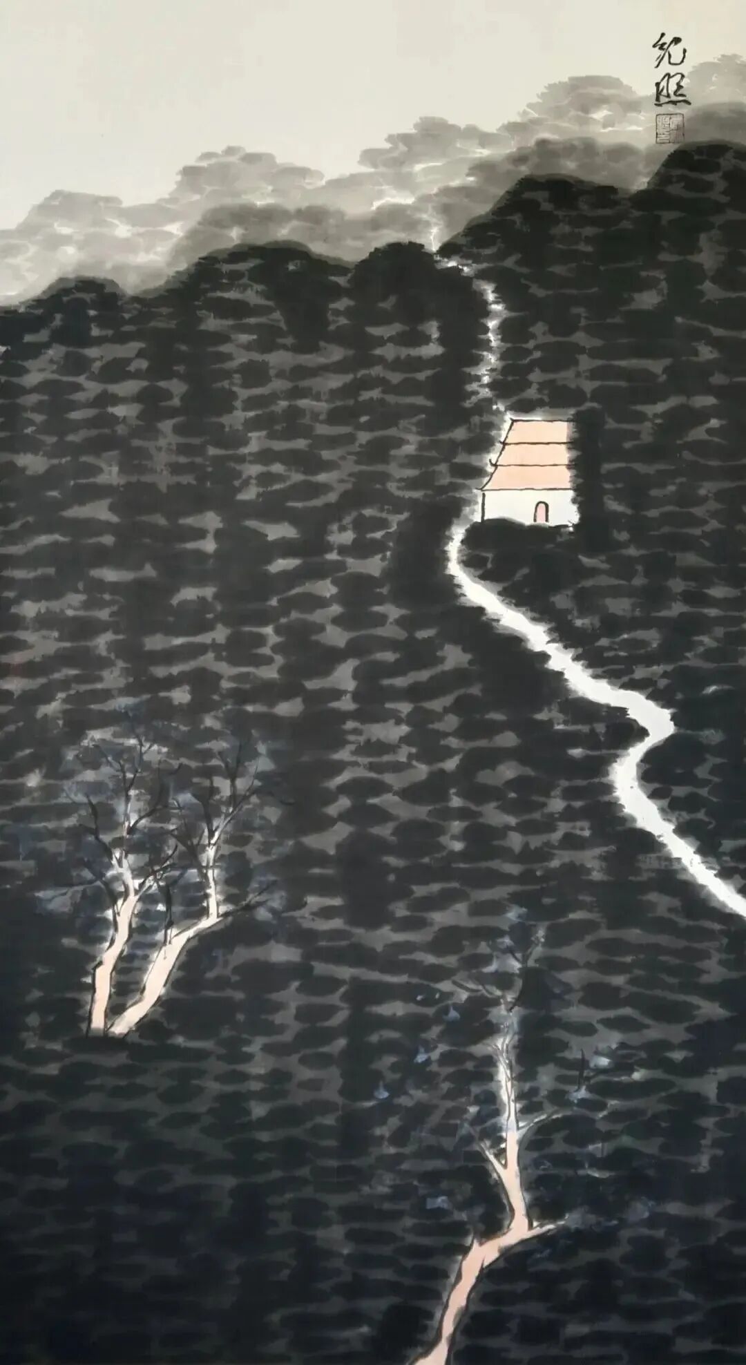 亭臺則承載著“休憩與沉思”的內(nèi)涵。無論是焦墨山水中山腰的方亭,還是“意畫詩境”里的古樸方亭,都是人在天地間的精神驛站,象征著在奔波與求索中,尋找片刻的安寧,進行自我反思與精神沉淀。這些意象相互交織,共同構(gòu)建起嚴紀照繪畫的精神符號體系,讓觀者在解讀意象的過程中,完成與自我、與世界的對話。